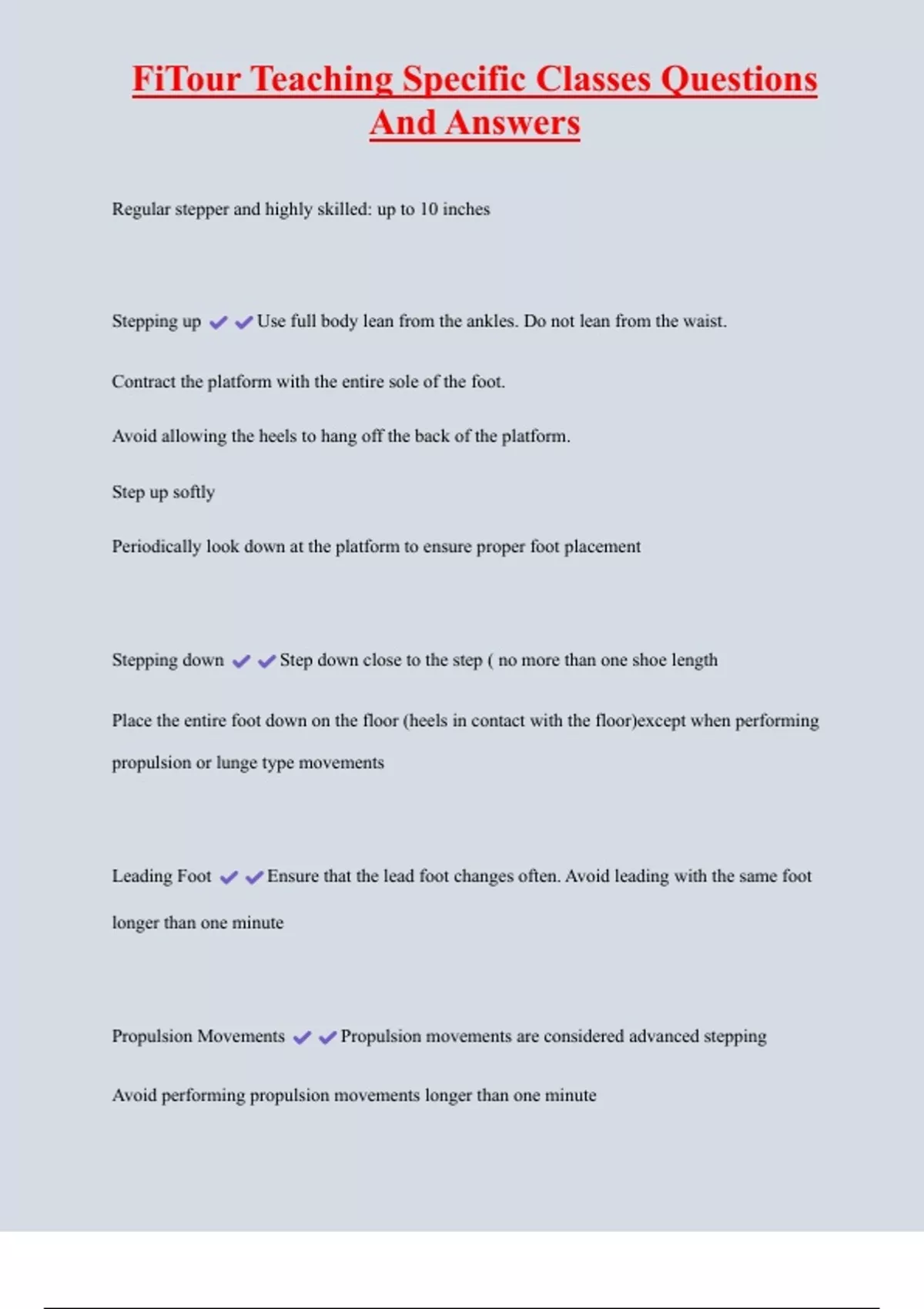 FiTour Teaching Specific Classes Questions And Answers Regular stepper and highly skilled: up to 10 inches Stepping up Use full body lean from the ankles. Do not lean from the waist. Contract the platform with the entire sole of the foot. Avoid allowing the heels to hang off the back of the platform. Step up softly Periodically look down at the platform to ensure proper foot placement Stepping down Step down close to the step ( no more than one shoe length Place the entire foot down on the floor (heels in contact with the floor)except when performing propulsion or lunge type movements Leading Foot Ensure that the lead foot changes often. Avoid leading with the same foot longer than one minute