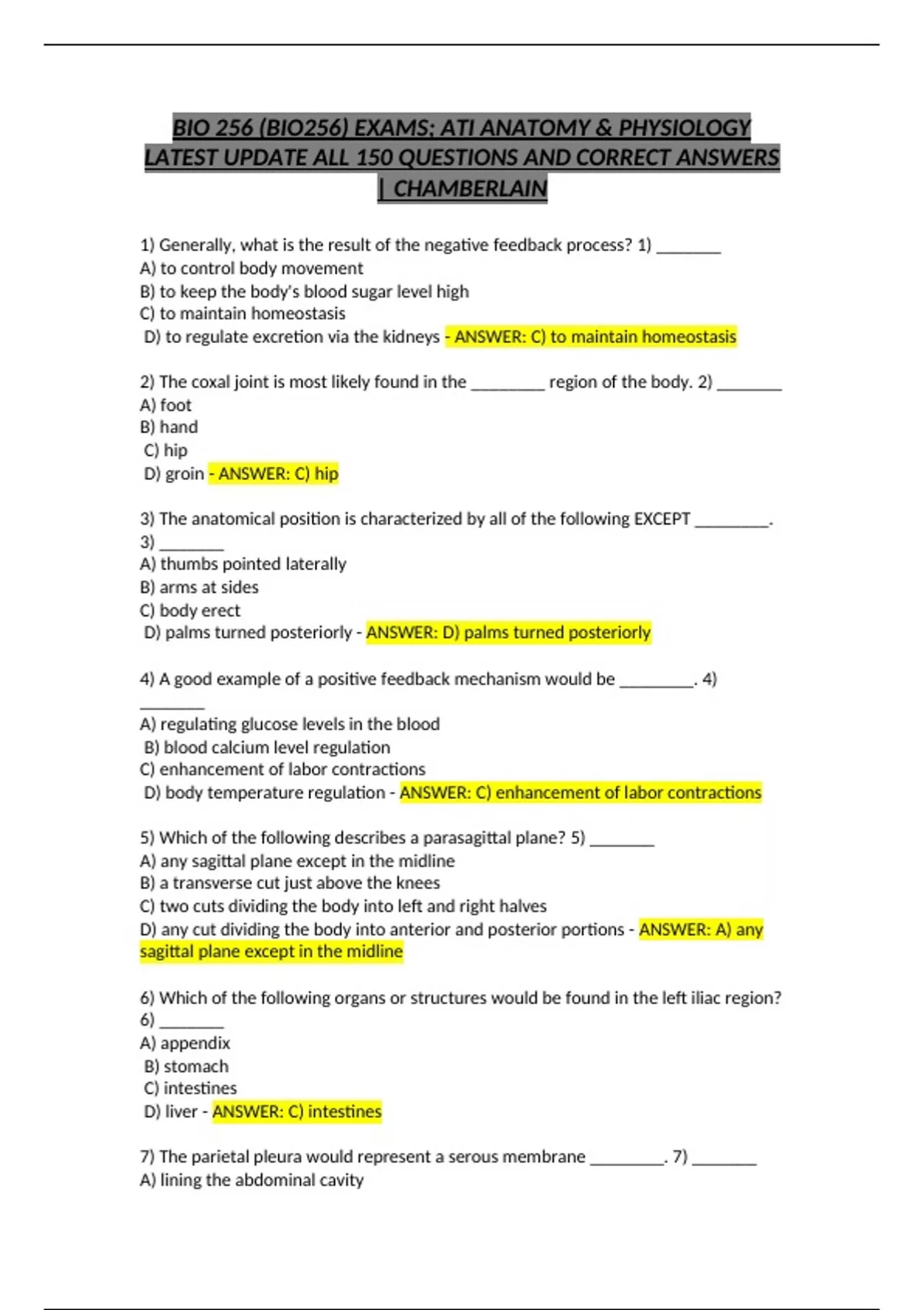 BIO 256 (BIO256) EXAMS; ATI ANATOMY & PHYSIOLOGY