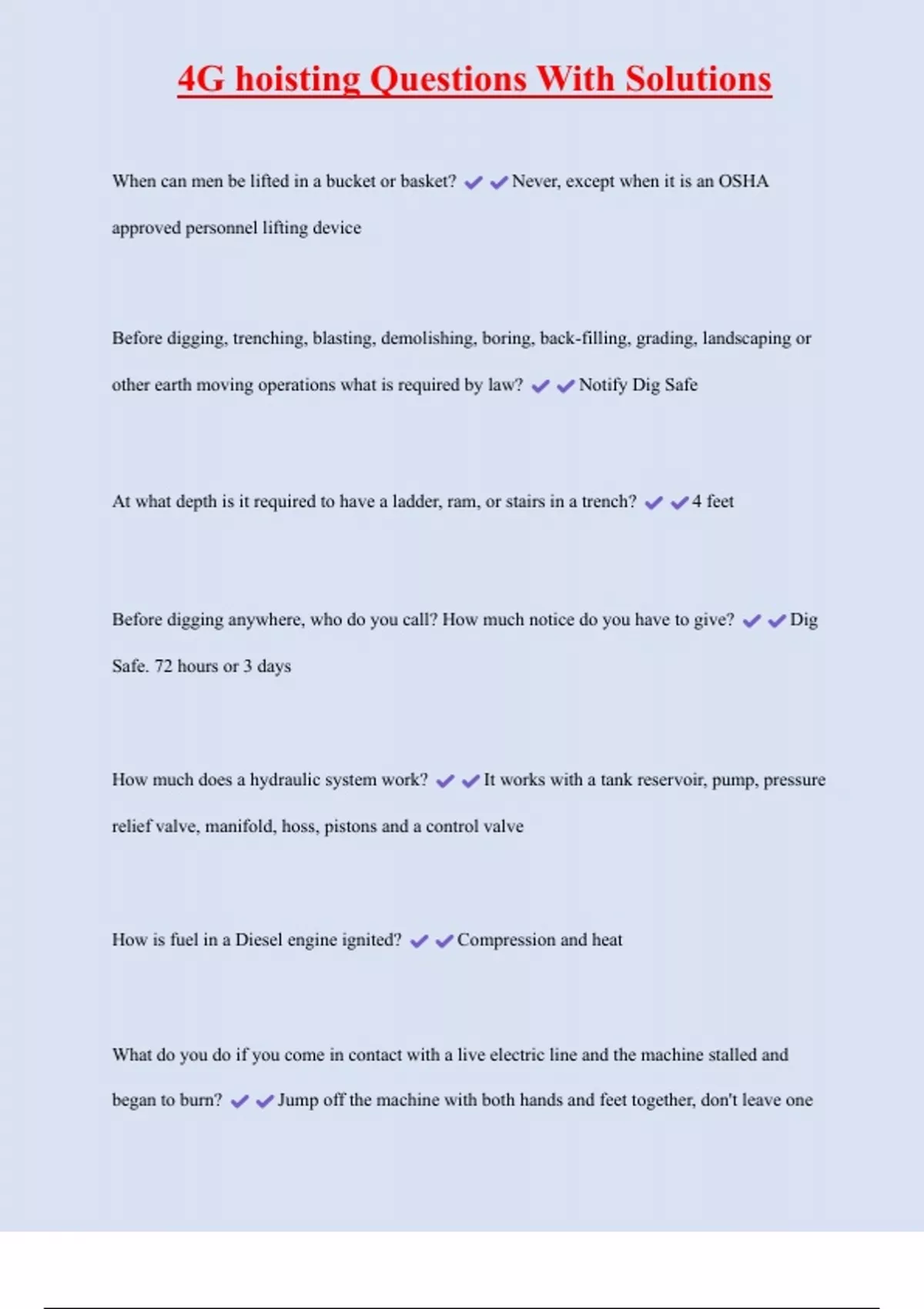 4G hoisting Questions With Solutions When can men be lifted in a bucket or basket? Never, except when it is an OSHA approved personnel lifting device Before digging, trenching, blasting, demolishing, boring, back-filling, grading, landscaping or other earth moving operations what is required by law? Notify Dig Safe At what depth is it required to have a ladder, ram, or stairs in a trench? 4 feet Before digging anywhere, who do you call? How much notice do you have to give? Dig Safe. 72 hours or 3 days How much does a hydraulic system work? It works with a tank reservoir, pump, pressure relief valve, manifold, hoss, pistons and a control valve
