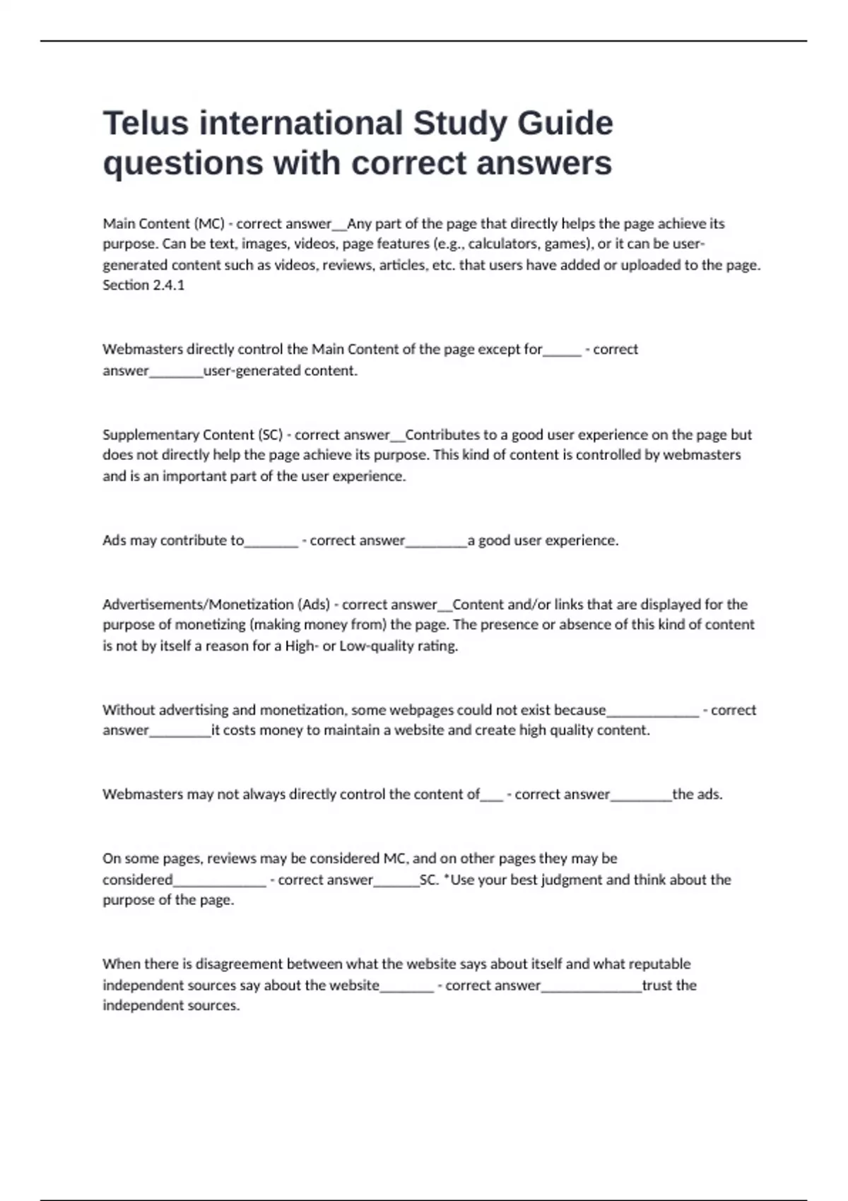 Telus international Study Guide questions with correct answers