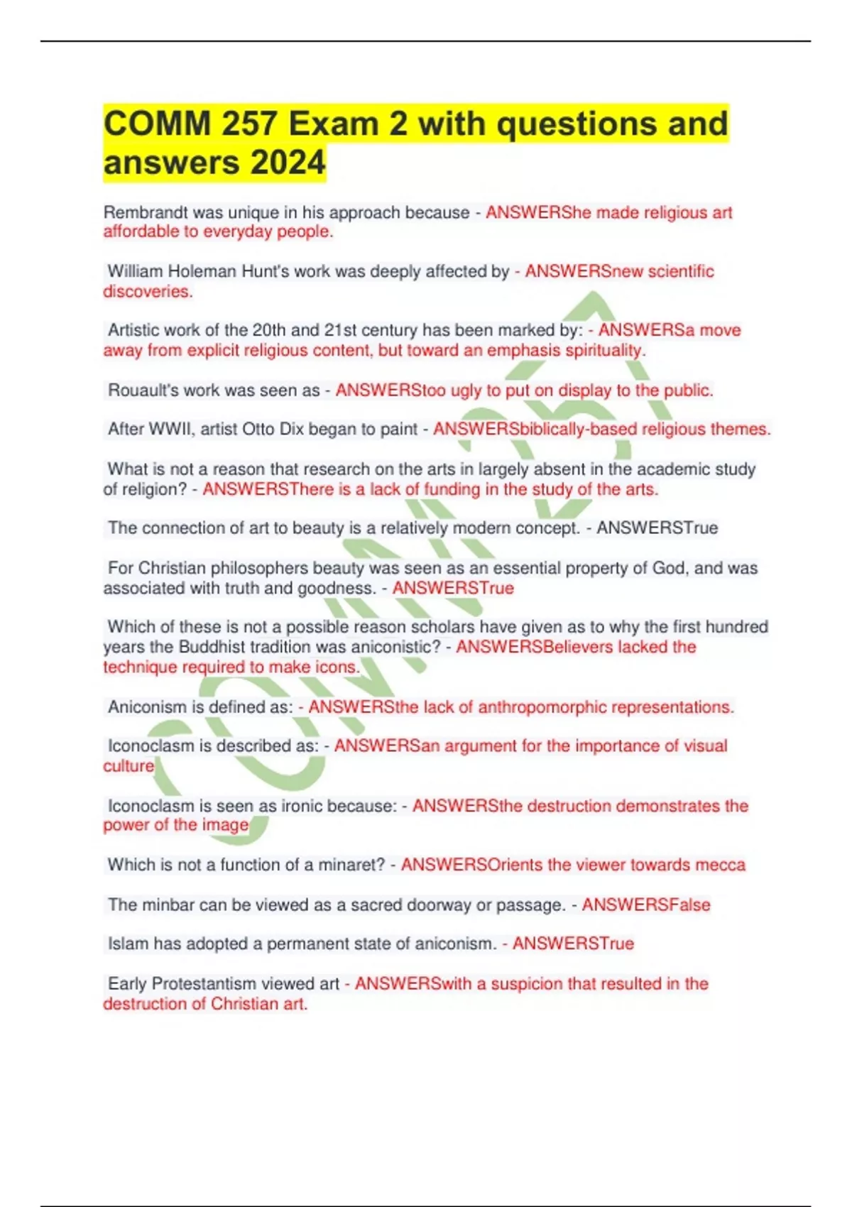 COMM 257 Exam 2 with questions and answers 2024 Rembrandt was unique in his approach because - ANSWERShe made religious art affordable to everyday people. William Holeman Hunt's work was deeply affected by - ANSWERSnew scientific discoveries. Artistic work of the 20th and 21st century has been marked by: - ANSWERSa move away from explicit religious content, but toward an emphasis spirituality. Rouault's work was seen as - ANSWERStoo ugly to put on display to the public. After WWII, artist Otto Dix began to paint - ANSWERSbiblically-based religious themes. What is not a reason that research on the arts in largely absent in the academic study of religion? - ANSWERSThere is a lack of funding in the study of the arts. The connection of art to beauty is a relatively modern concept. - ANSWERSTrue For Christian philosophers beauty was seen as an essential property of God, and was associated with truth and goodness. - ANSWERSTrue Which of these is not a possible reason scholars have given as to why the first hundred years the Buddhist tradition was aniconistic? - ANSWERSBelievers lacked the technique required to make icons. Aniconism is defined as: - ANSWERSthe lack of anthropomorphic representations. Iconoclasm is described as: - ANSWERSan argument for the importance of visual culture Iconoclasm is seen as ironic because: - ANSWERSthe destruction demonstrates the power of the image Which is not a function of a minaret? - ANSWERSOrients the viewer towards mecca The minbar can be viewed as a sacred doorway or passage. - ANSWERSFalse Islam has adopted a permanent state of aniconism. - ANSWERSTrue Early Protestantism viewed art - ANSWERSwith a suspicion that resulted in the destruction of Christian art.