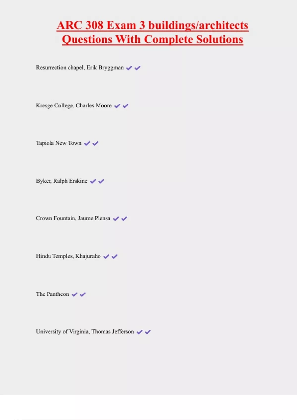 ARC 308 Exam 3 buildings/architects Questions With Complete Solutions Resurrection chapel, Erik Bryggman Kresge College, Charles Moore Tapiola New Town Byker, Ralph Erskine Crown Fountain, Jaume Plensa Hindu Temples, Khajuraho The Pantheon