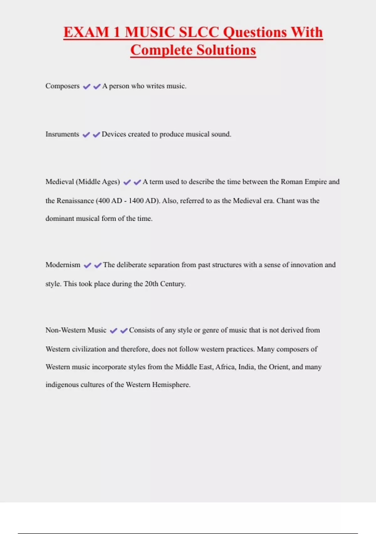 EXAM 1 MUSIC SLCC Questions With Complete Solutions Composers A person who writes music. Insruments Devices created to produce musical sound. Medieval (Middle Ages) A term used to describe the time between the Roman Empire and the Renaissance (400 AD - 1400 AD). Also, referred to as the Medieval era. Chant was the dominant musical form of the time. Modernism The deliberate separation from past structures with a sense of innovation and style. This took place during the 20th Century.