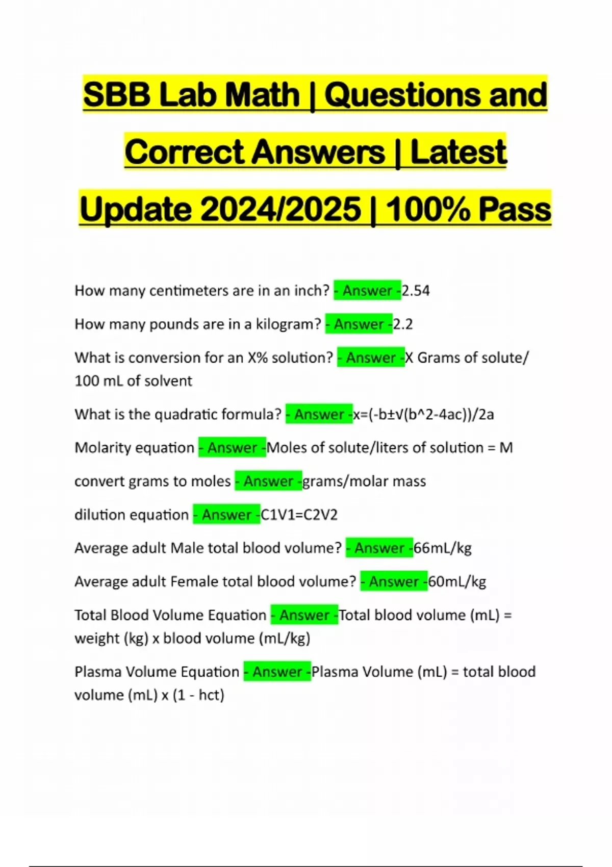 SBB Lab Math | Questions and Correct Answers | Latest Update 2024/2025 | 100% Pass How many centimeters are in an inch? - Answer -2.54 How many pounds are in a kilogram? - Answer -2.2 What is conversion for an X% solution? - Answer -X Grams of solute/ 100 mL of solvent What is the quadratic formula? - Answer -x=(-b±√(b^2-4ac))/2a Molarity equation - Answer -Moles of solute/liters of solution = M convert grams to moles - Answer -grams/