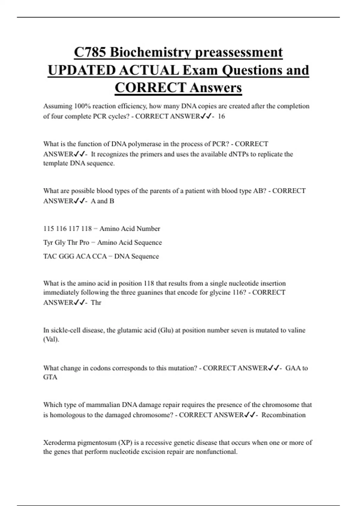 C785 Biochemistry preassessment UPDATED ACTUAL Exam Questions and CORRECT Answers