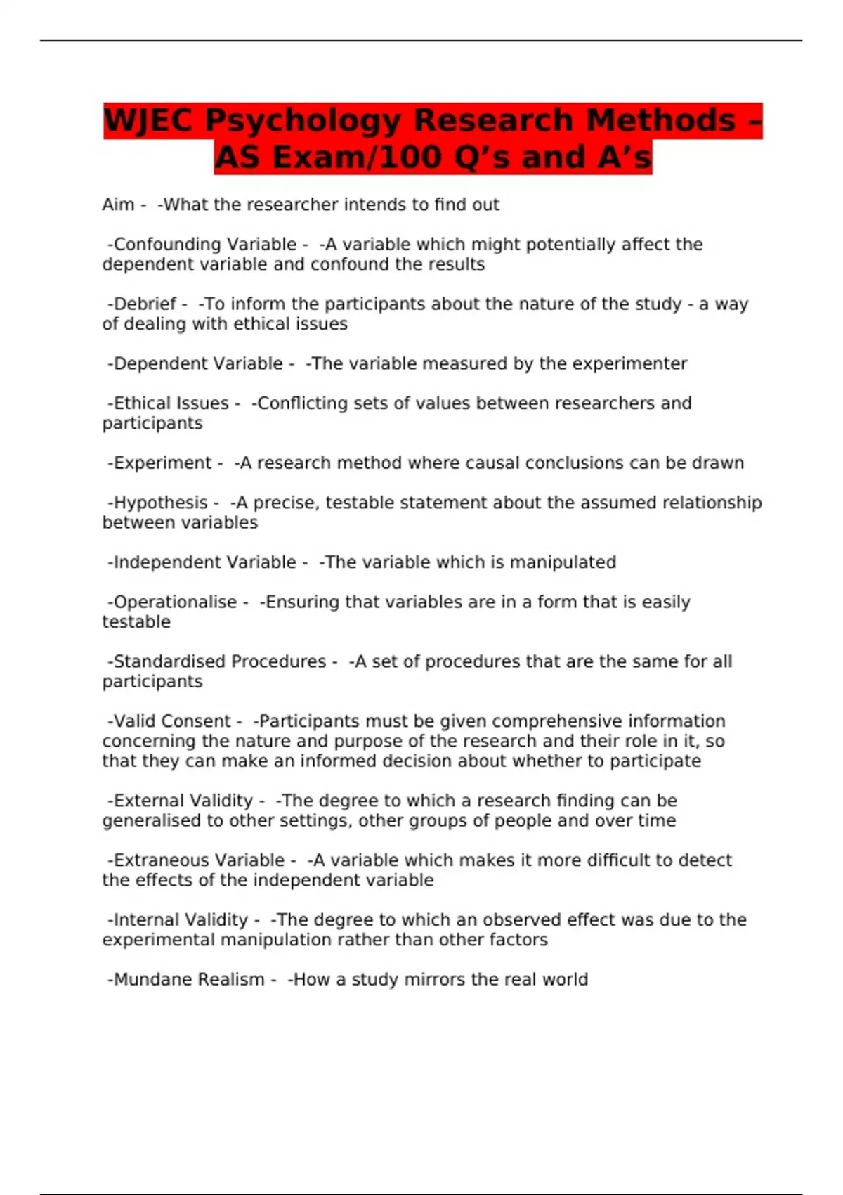 WJEC Psychology Research Methods – AS Exam/100 Q’s and A’s