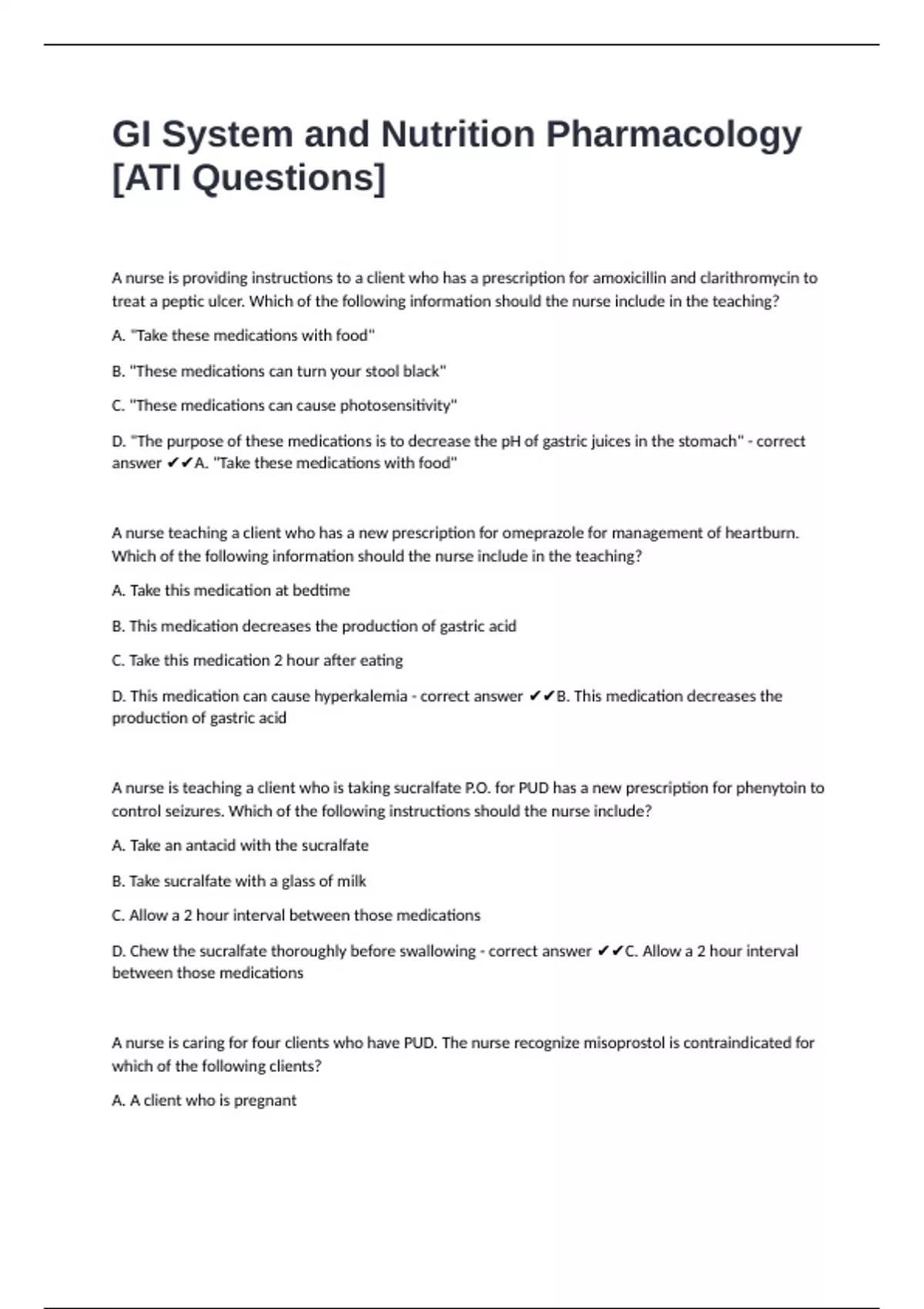 GI System and Nutrition Pharmacology [ATI Questions] with correct answers A+ rated