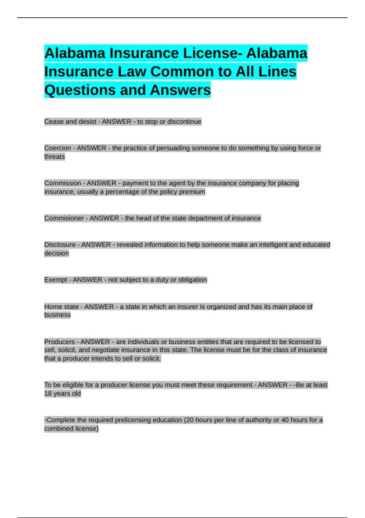 Alabama Insurance License- Alabama Insurance Law Common to All Lines Questions and AnswersAlabama Insurance License- Alabama Insurance Law Common to All Lines Questions and AnswersAlabama Insurance License- Alabama Insurance Law Common to All Lines Questions and AnswersAlabama Insurance License- Alabama Insurance Law Common to All Lines Questions and Answers Cease and desist - ANSWER - to stop or discontinue Coercion - ANSWER - the practice of persuading someone to do something by using force or threats Commission - ANSWER - payment to the agent by the insurance company for placing insurance, usually a percentage of the policy premium Commisioner - ANSWER - the head of the state department of insurance Disclosure - ANSWER - revealed information to help someone make an intelligent and educated decision Exempt - ANSWER - not subject to a duty or obligation