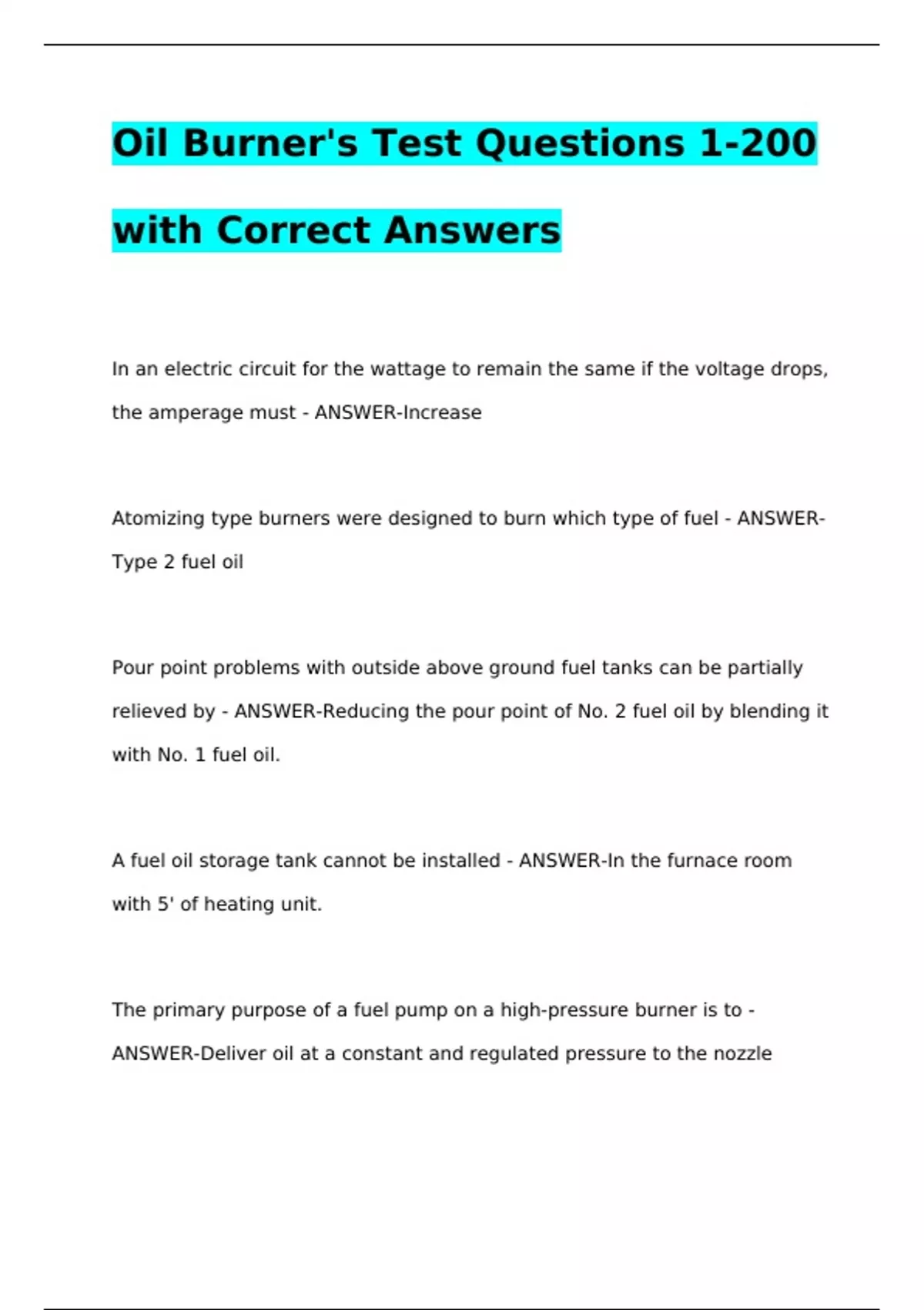 Oil Burner's Test Questions 1-200 with Correct AnswersOil Burner's Test Questions 1-200 with Correct AnswersOil Burner's Test Questions 1-200 with Correct AnswersOil Burner's Test Questions 1-200 with Correct AnswersIn an electric circuit for the wattage to remain the same if the voltage drops, the amperage must - ANSWER-Increase Atomizing type burners were designed to burn which type of fuel - ANSWER-Type 2 fuel oil Pour point problems with outside above ground fuel tanks can be partially relieved by - ANSWER-Reducing the pour point of No. 2 fuel oil by blending it with No. 1 fuel oil.