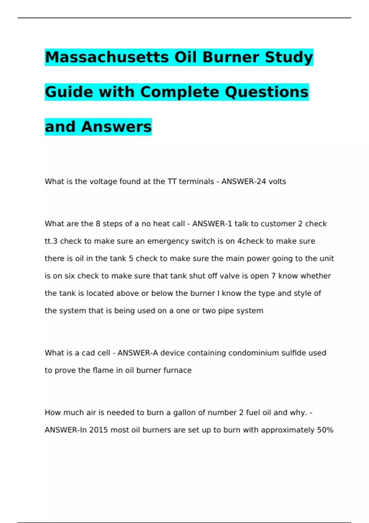Massachusetts Oil Burner Study Guide with Complete Questions and AnswersMassachusetts Oil Burner Study Guide with Complete Questions and AnswersMassachusetts Oil Burner Study Guide with Complete Questions and AnswersMassachusetts Oil Burner Study Guide with Complete Questions and Answers What is the voltage found at the TT terminals - ANSWER-24 volts What are the 8 steps of a no heat call - ANSWER-1 talk to customer 2 check tt.3 check to make sure an emergency switch is on 4check to make sure there is oil in the tank 5 check to make sure the main power going to the unit is on six check to make sure that tank shut off valve is open 7 know whether the tank is located above or below the burner I know the type and style of the system that is being used on a one or two pipe system