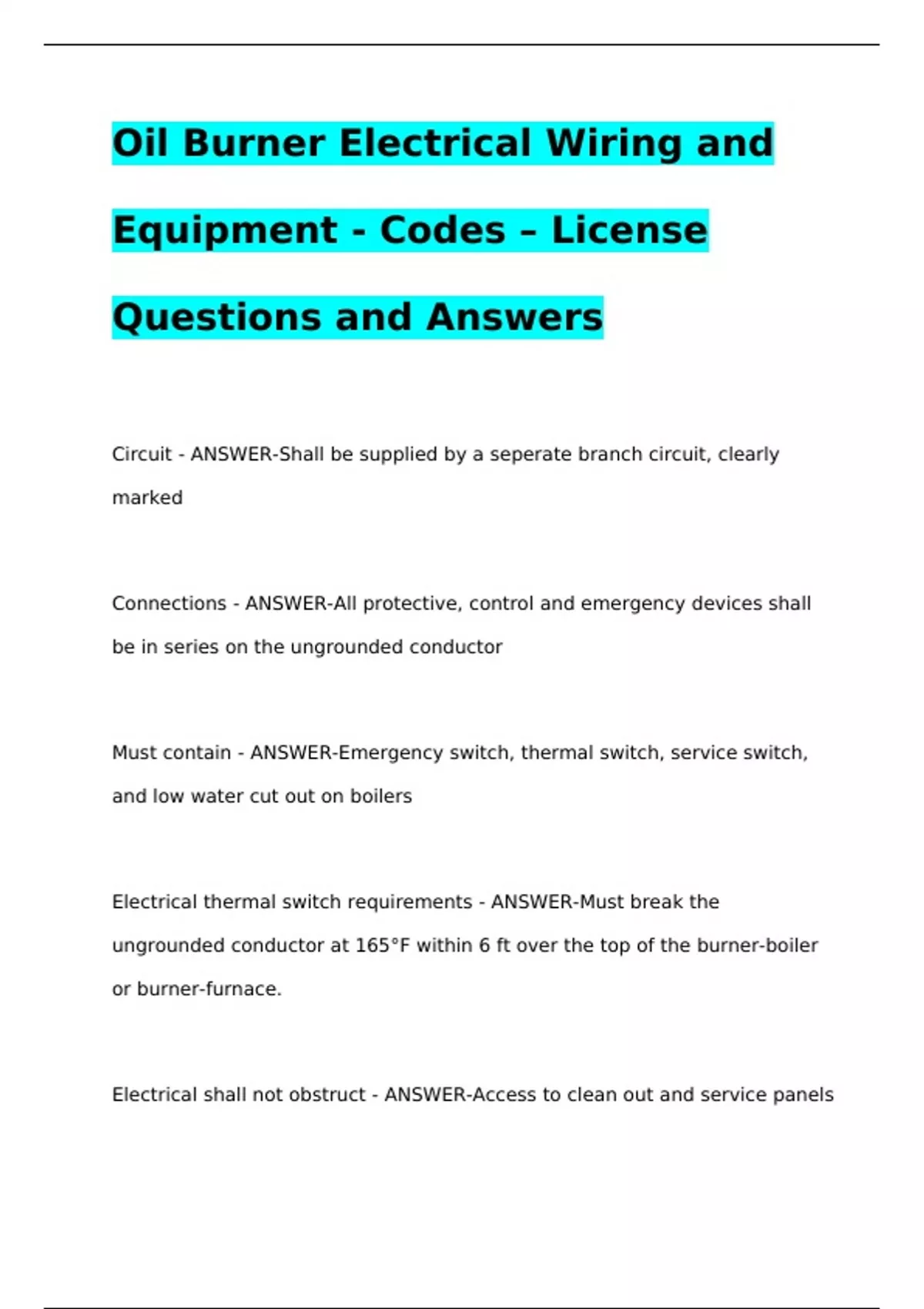 Oil Burner Electrical Wiring and Equipment - Codes – License Questions and AnswersOil Burner Electrical Wiring and Equipment - Codes – License Questions and AnswersOil Burner Electrical Wiring and Equipment - Codes – License Questions and AnswersCircuit - ANSWER-Shall be supplied by a seperate branch circuit, clearly marked Connections - ANSWER-All protective, control and emergency devices shall be in series on the ungrounded conductor