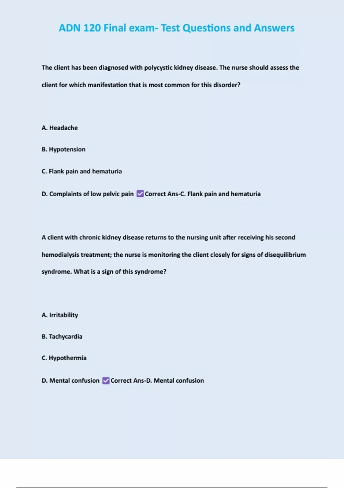 , ADN 120 Final exam- Test Questions and Answers