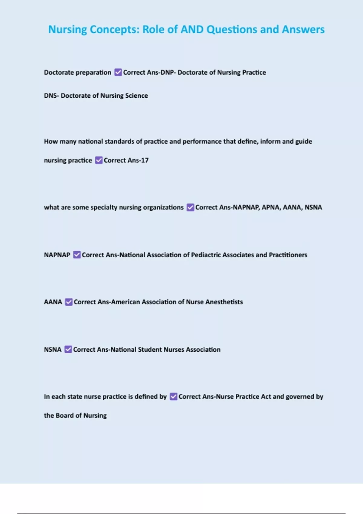 , Nursing Concepts: Role of AND Questions and Answers