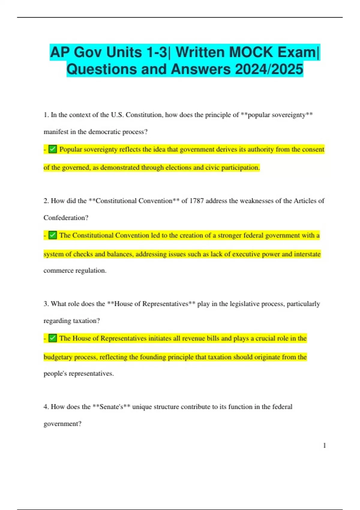 AP Gov Units 1-3| Written MOCK Exam| Questions and Answers 2024/2025 1. In the context of the U.S. Constitution, how does the principle of **popular sovereignty** manifest in the democratic process? - Popular sovereignty reflects the idea that government derives its authority from the consent of the governed, as demonstrated through elections and civic participation. 2. How did the **Constitutional Convention** of 1787 address the weaknesses of the Articles of Confederation? - The Constitutional Convention led to the creation of a stronger federal government with a system of checks and balances, addressing issues such as lack of executive power and interstate commerce regulation. 3. What role does the **House of Representatives** play in the legislative process, particularly regarding taxation? - The House of Representatives initiates all revenue bills and plays a crucial role in the budgetary process, reflecting the founding principle that taxation should originate from the people's representatives. 4. How does the **Senate's** unique structure contribute to its function in the federal government? 2 - The Senate’s structure, with two senators from each state, allows for equal representation of states, providing a check on the more populous House and fostering bipartisan deliberation. 5. In what ways does **the veto power** enhance the President's role in the legislative process? - The veto power allows the President to reject legislation passed by Congress, serving as a check on legislative authority and prompting lawmakers to consider the executive's priorities. 6. Discuss the significance of **federalism** in the context of U.S. governance. - Federalism divides power between national and state governments, allowing for local governance while ensuring national cohesion, and enabling states to tailor policies to their specific needs. 7. How does **the First Amendment** protect the rights of individuals in the United States? - The First Amendment guarantees freedoms concerning religion, expression, assembly, and the right to petition the government, protecting individual liberties from government interference. 8. What is the purpose of **checks and balances** in the U.S. government system? - Checks and balances are designed to prevent any one branch of government from becoming too powerful by ensuring that each branch has the ability to limit the powers of the others. 9. Explain the concept of **judicial review** and its impact on American law. 3 - Judicial review is the power of courts to determine the constitutionality of legislative and executive actions, shaping the interpretation of laws and safeguarding constitutional rights. 10. How did the **Civil Rights Act of 1964** influence the civil rights movement in the United States? - The Civil Rights Act of 1964 prohibited discrimination based on race, color, religion, sex, or national origin, serving as a landmark legislative achievement that advanced civil rights and equality. 11. In what ways do **interest groups** impact the policy-making process in the U.S.? - Interest groups influence policy-making by lobbying government officials, mobilizing public opinion, and funding campaigns, thereby shaping legislation to align with their specific interests. 12. Discuss the implications of **gerrymandering** on electoral outcomes and repr