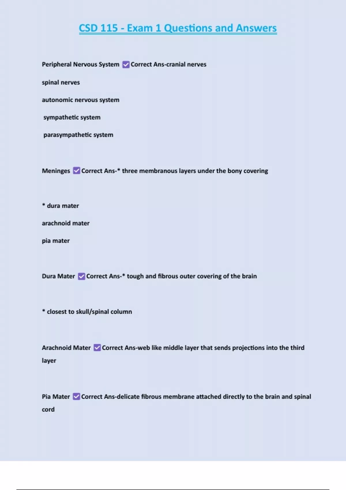 Pia Mater Correct Ans-delicate fibrous membrane attached directly to the brain and spinal
