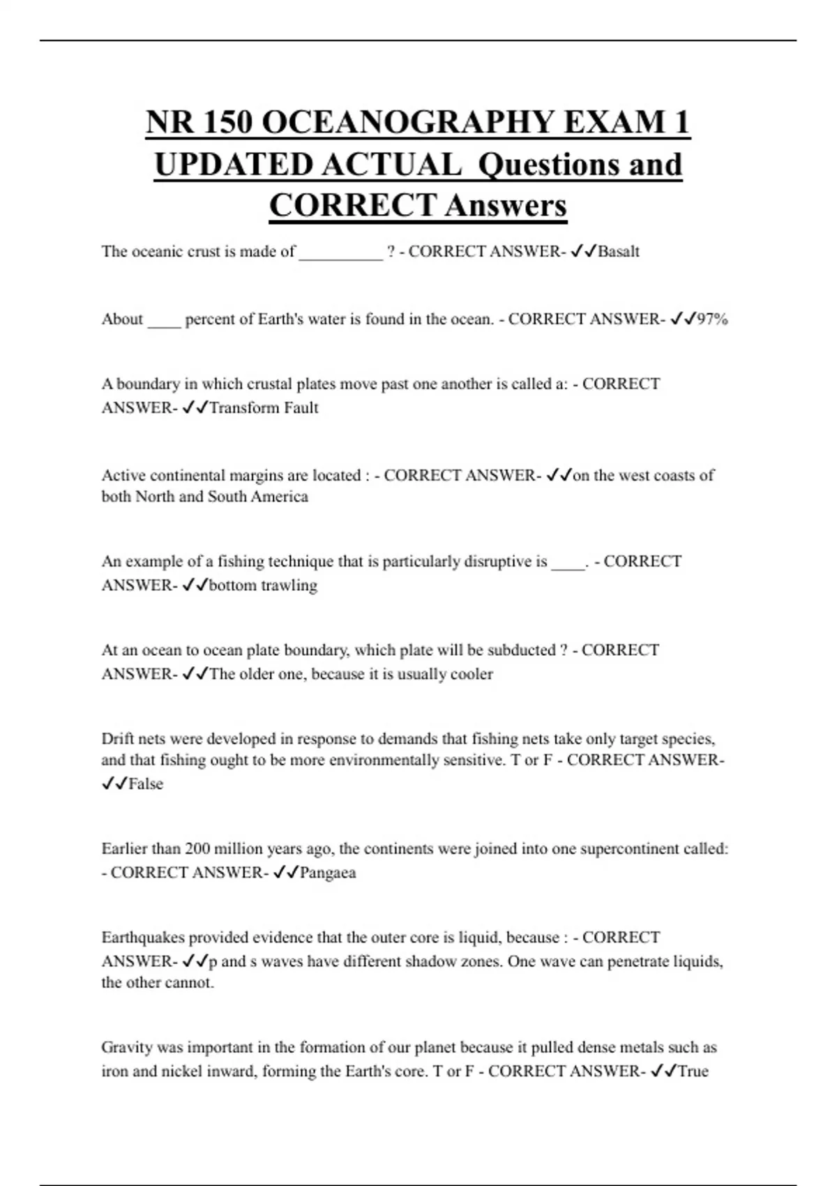 NR 150 OCEANOGRAPHY EXAM 1 UPDATED ACTUAL Questions and CORRECT Answers The oceanic crust is made of __________ ? - CORRECT ANSWER- Basalt About ____ percent of Earth's water is found in the ocean. - CORRECT ANSWER- 97% A boundary in which crustal plates move past one another is called a: - CORRECT ANSWER- Transform Fault