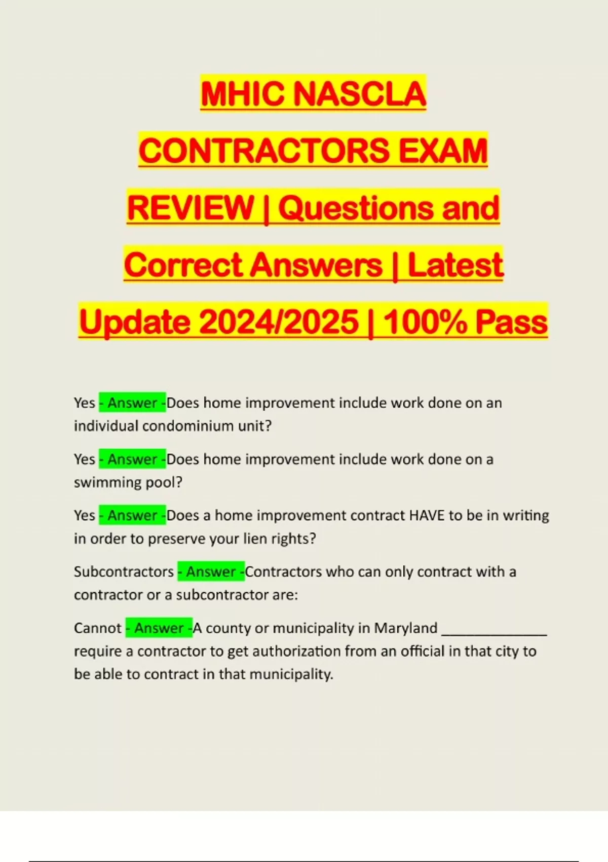 MHIC NASCLA CONTRACTORS EXAM REVIEW | Questions and Correct Answers | Latest Update 2024/2025 | 100% Pass Yes - Answer -Does home improvement include work done on an individual condominium unit? Yes - Answer -Does home improvement include work done on a swimming pool? Yes - Answer -Does a home improvement contract HAVE to be in writing in order to preserve your lien rights? Subcontractors - Answer -Contractors who can only contract with a contractor or a subcontractor are: Cannot - Answer -A county or municipality in Maryland _____________ require a contractor to get authorization from an official in that city to be able to contract in that municipality.Can - Answer -A county or municipality in Maryland _______________ regulate the character, performance and quality of home improvement. 7 - Answer -How many members are there in the Maryland Home Improvement Commission?