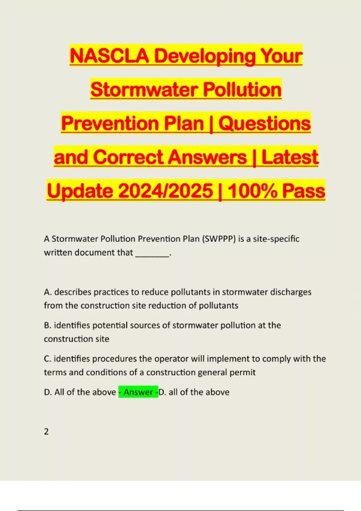 NASCLA Developing Your Stormwater Pollution Prevention Plan | Questions and Correct Answers | Latest Update 2024/2025 | 100% Pass A Stormwater Pollution Prevention Plan (SWPPP) is a site-specific written document that _______. A. describes practices to reduce pollutants in stormwater discharges from the construction site reduction of pollutants B. identifies potential sources of stormwater pollution at the construction site C. identifies procedures the operator will implement to comply with the terms and conditions of a construction general permit D. All of the above - Answer -D. all of the above 2The primary stormwater pollutant at a construction site is _______. A. trash and debris