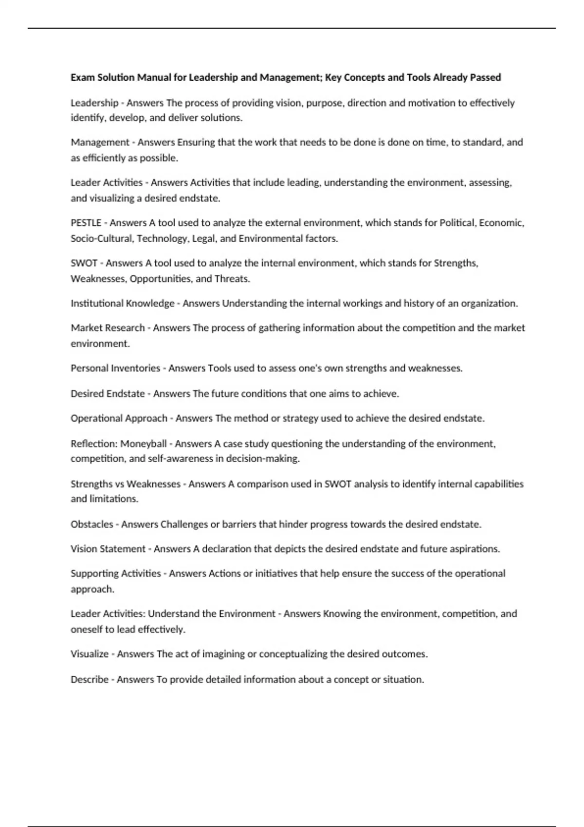 Leadership - Answers The process of providing vision, purpose, direction and motivation to effectively