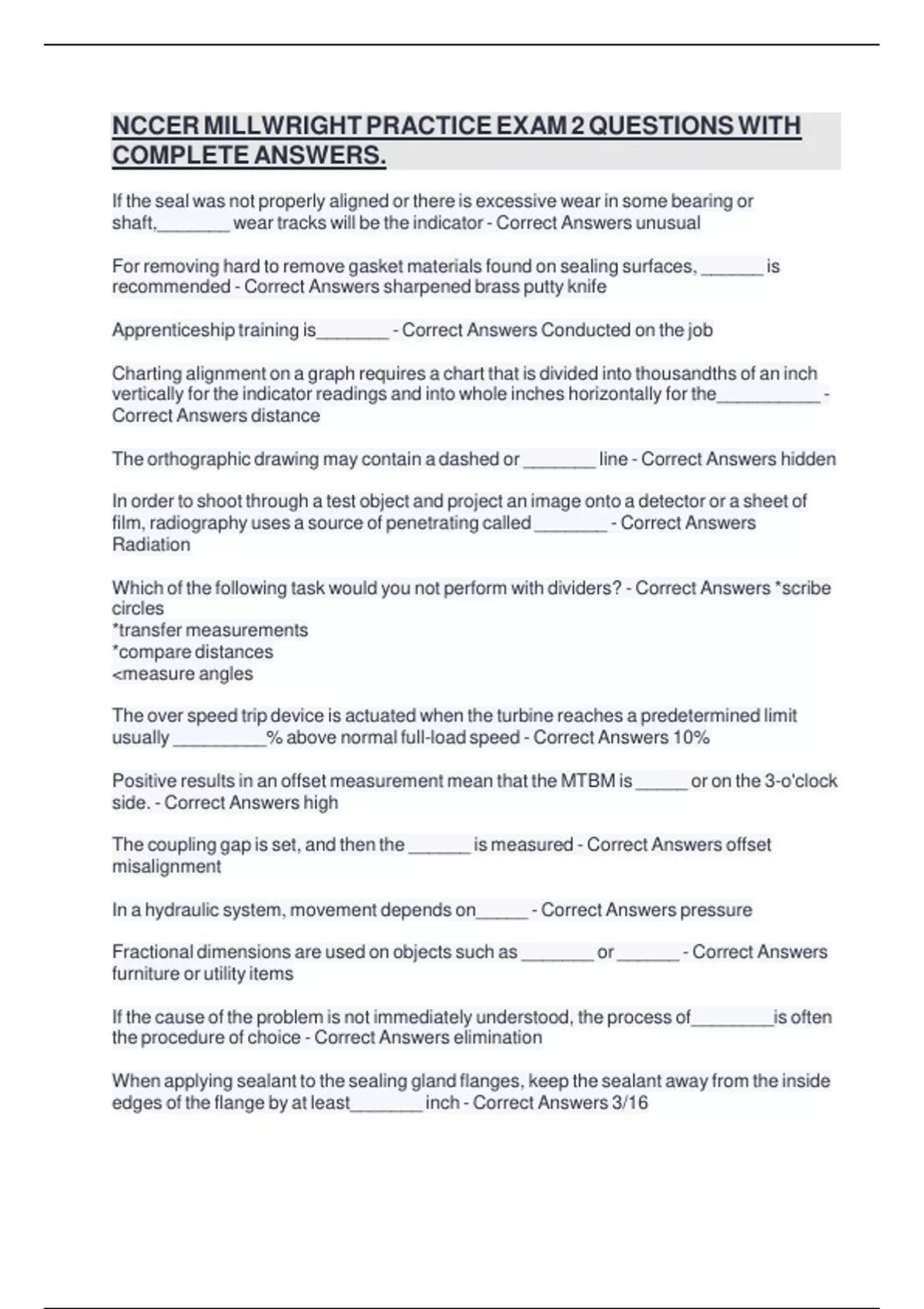 NCCER MILLWRIGHTPRACTICEEXAM 2QUESTIONSWITH COMPLETE ANSWERS. If the seal was not properly aligned or there is excessive wear in some bearing or shaft,_______ wear tracks will be the indicator - Correct Answers unusual For removing hard to remove gasket materials found on sealing surfaces, ______ is recommended - Correct Answers sharpened brass putty knife Apprenticeship training is_______ - Correct Answers Conducted on the job Charting alignment on a graph requires a chart that is divided into thousandths of an inch vertically for the indicator readings and into whole inches horizontally for the__________ - Correct Answers distanc