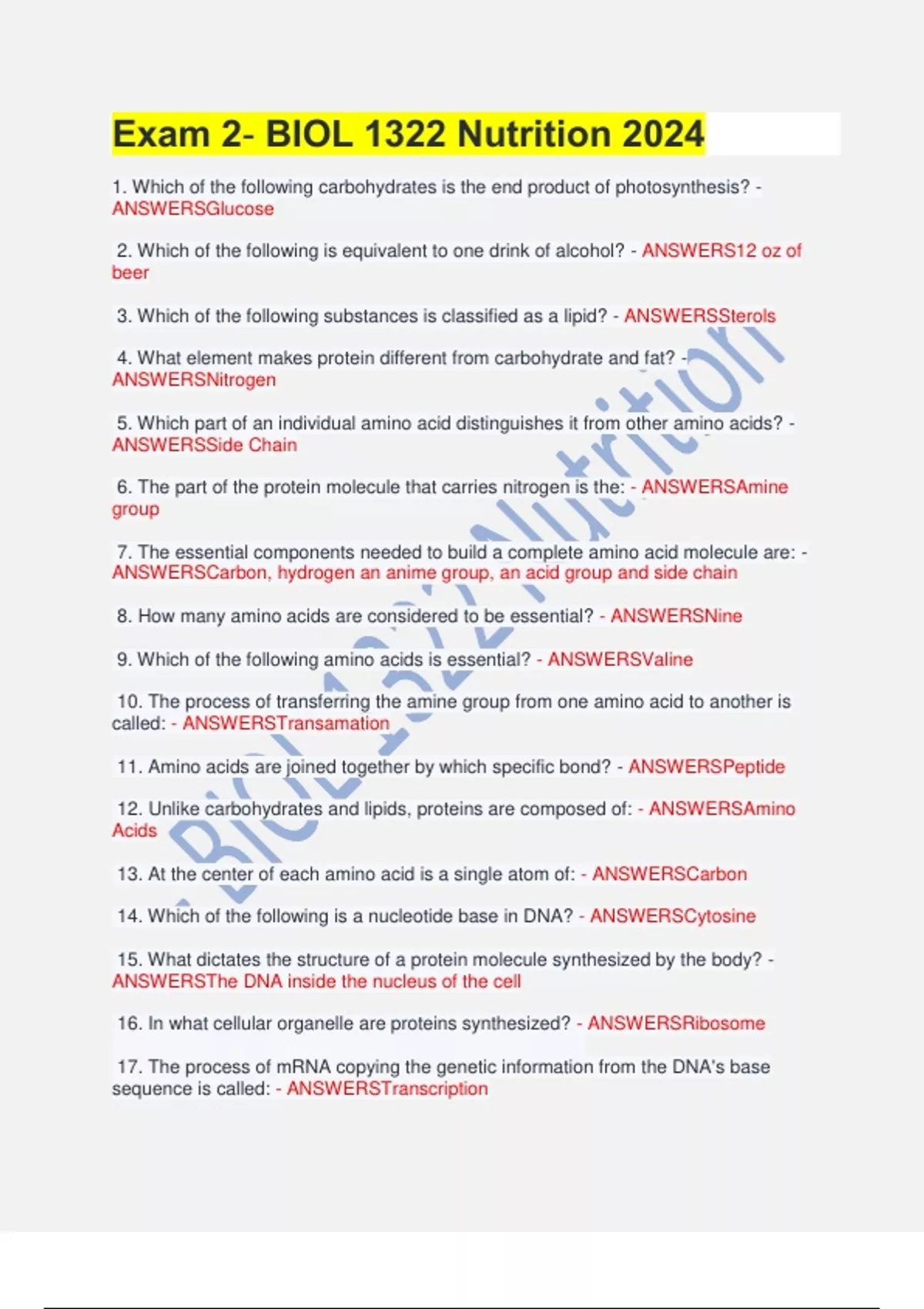 Exam 2- BIOL 1322 Nutrition 2024 1. Which of the following carbohydrates is the end product of photosynthesis? - ANSWERSGlucose 2. Which of the following is equivalent to one drink of alcohol? - ANSWERS12 oz of beer 3. Which of the following substances is classified as a lipid? - ANSWERSSterols 4. What element makes protein different from carbohydrate and fat? - ANSWERSNitrogen 5. Which part of an individual amino acid distinguishes it from other amino acids? - ANSWERSSide Chain 6. The part of the protein molecule that carries nitrogen is the: - ANSWERSAmine group 7. The essential components needed to build a complete amino acid molecule are: - ANSWERSCarbon, hydrogen an anime group, an acid group and side chain 8. How many amino acids are considered to be essential? - ANSWERSNine 9. Which of the following amino acids is essential? - ANSWERSValine 10. The process of transferring the amine group from one amino acid to another is called: - ANSWERSTransamation 11. Amino acids are joined together by which specific bond? - ANSWERSPeptide 12. Unlike carbohydrates and lipids, proteins are composed of: - ANSWERSAmino Acids 13. At the center of each amino acid is a single atom of: - ANSWERSCarbon 14. Which of the following is a nucleotide base in DNA? - ANSWERSCytosine 15. What dictates the structure of a protein molecule synthesized by the body? - ANSWERSThe DNA inside the nucleus of the cell 16. In what cellular organelle are proteins synthesized? - ANSWERSRibosome 17. The process of mRNA copying the genetic information from the DNA's base sequence is called: - ANSWERSTranscription