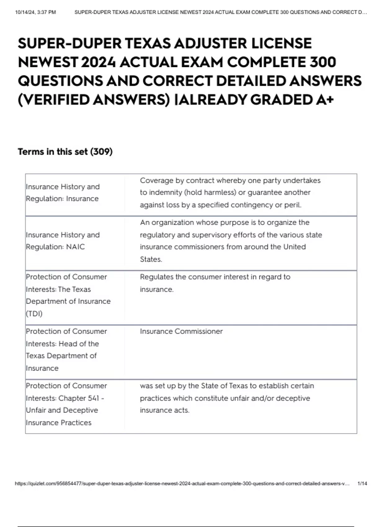 , 10/14/24, 3:37 PM SUPER-DUPER TEXAS ADJUSTER LICENSE NEWEST 2024 ACTUAL EXAM COMPLETE 300 QUESTIONS AND CORRECT D…