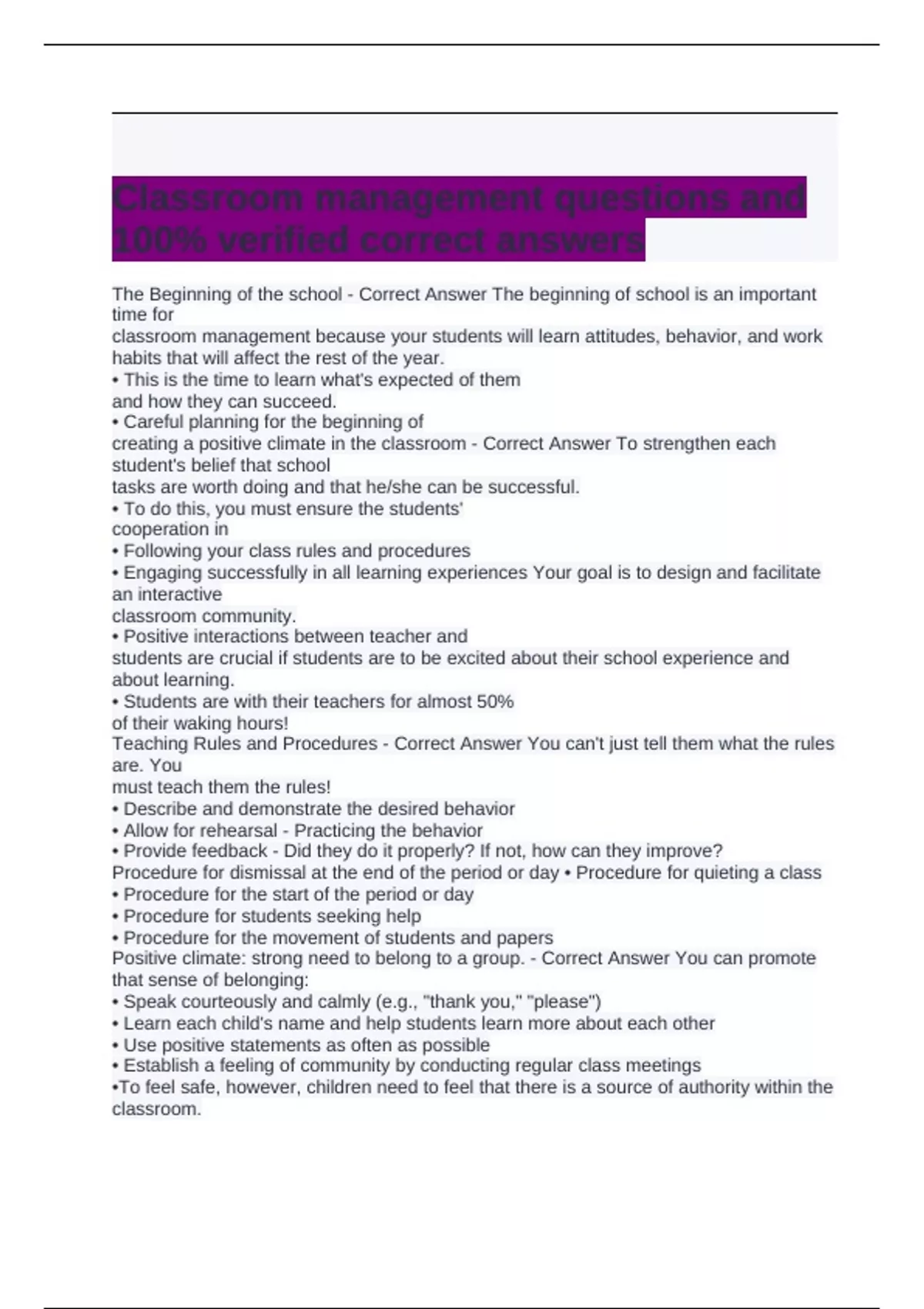 Classroom management questions and 100% verified correct answers The Beginning of the school - Correct Answer The beginning of school is an important time for classroom management because your students will learn attitudes, behavior, and work habits that will affect the rest of the year. • This is the time to learn what's expected of them and how they can succeed. • Careful planning for the beginning of creating a positive climate in the classroom - Correct Answer To strengthen each student's belief that school tasks are worth doing and that he/she can be successful. • To do this, you must ensure the students' cooperation in • Following your class rules and procedures • Engaging successfully in all learning experiences Your goal is to design and facilitate an interactive classroom community. • Positive interactions between teacher and students are crucial if students are to be excited about their school experience and about learning. • Students are with their teachers for almost 50% of their waking hours! Teaching Rules and Procedures - Correct Answer You can't just tell them what the rules are. You must teach them the rules! • Describe and demonstrate the desired behavior • Allow for rehearsal - Practicing the behavior • Provide feedback - Did they do it properly? If not, how can they improve? Procedure for dismissal at the end of the period or day • Procedure for quieting a class • Procedure for the start of the period or day • Procedure for students seeking help • Procedure for the movement of students and papers