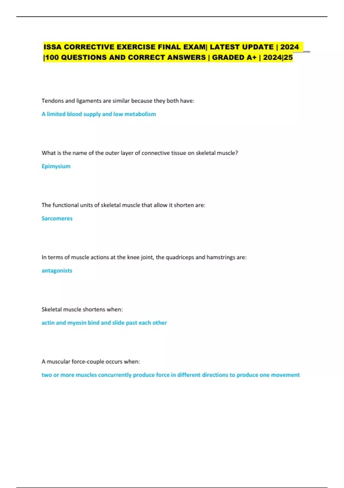 ISSA CORRECTIVE EXERCISE FINAL EXAM| LATEST UPDATE | 2024 |100 QUESTIONS AND CORRECT ANSWERS | GRADED A+ | 2024|25 Tendons and ligaments are similar because they both have: A limited blood supply and low metabolism What is the name of the outer layer of connective tissue on skeletal muscle? Epimysium The functional units of skeletal muscle that allow it shorten are: Sarcomeres In terms of muscle actions at the knee joint, the quadriceps and hamstrings are: antagonists Skeletal muscle shortens when: actin and myosin bind and slide past each other A muscular force-couple occurs when: two or more muscles concurrently produce force in different directions to produce one movement