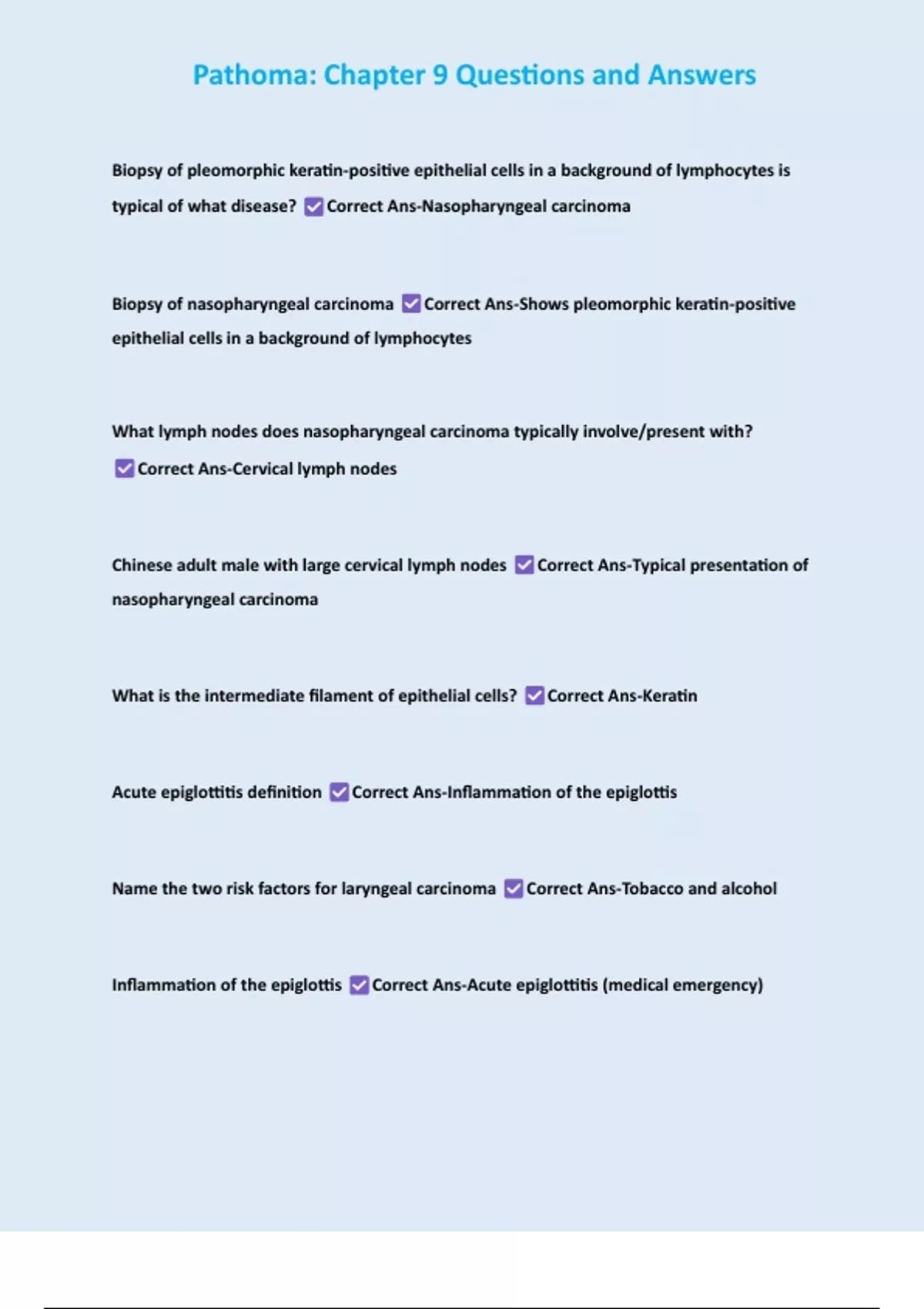 Biopsy of nasopharyngeal carcinoma Correct Ans-Shows pleomorphic keratin-positive