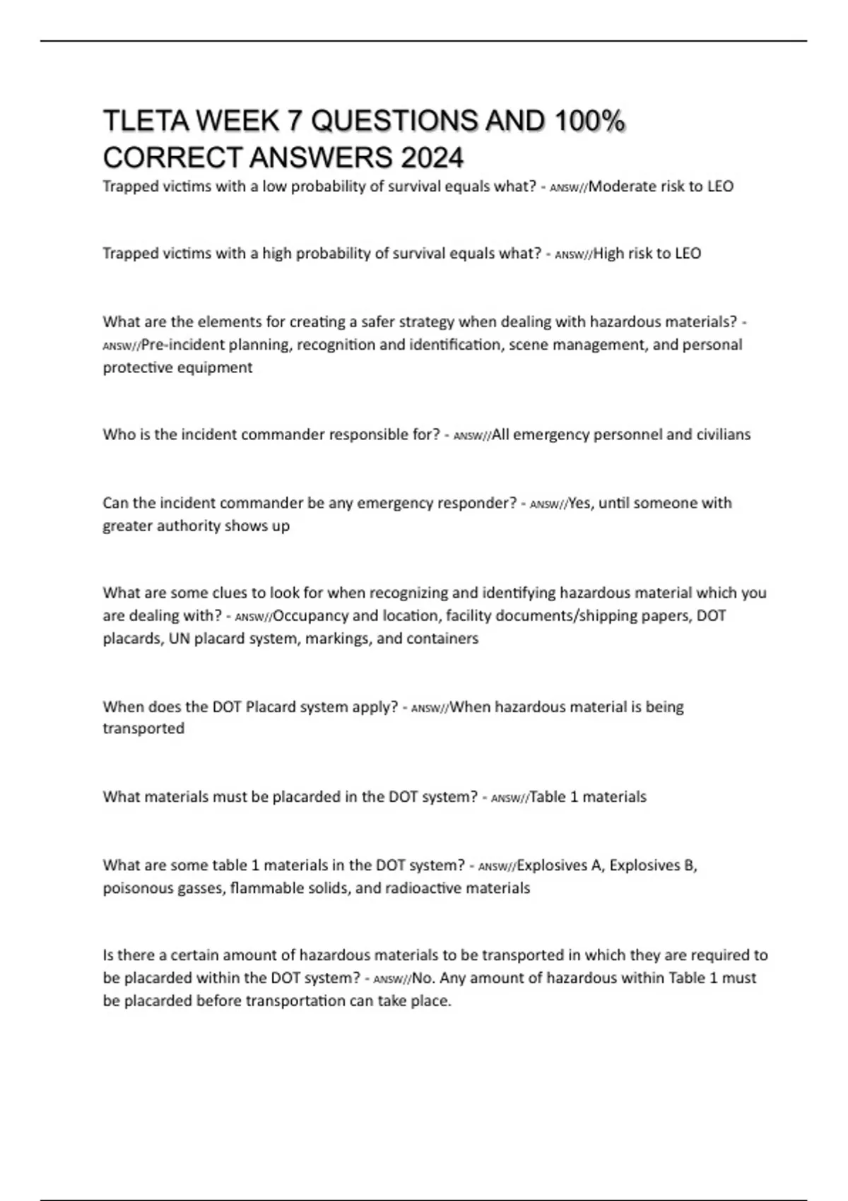 TLETA WEEK 7 QUESTIONS AND 100% CORRECT ANSWERS 2024 Trapped victims with a low probability of survival equals what? - ANSW//Moderate risk to LEO Trapped victims with a high probability of survival equals what? - ANSW//High risk to LEO What are the elements for creating a safer strategy when dealing with hazardous materials? - ANSW//Pre-incident planning, recognition and identification, scene management, and personal protective equipment Who is the incident commander responsible for? - ANSW//All emergency personnel and civilians Can the incident commander be any emergency responder? - ANSW//Yes, until someone with greater authority shows up What are some clues to look for when recognizing and identifying hazardous material which you are dealing with? - ANSW//Occupancy and location, facility documents/shipping papers, DOT placards, UN placard system, markings, and containers When does the DOT Placard system apply? - ANSW//When hazardous material is being transported What materials must be placarded in the DOT system? - ANSW//Table 1 materials What are some table 1 materials in the DOT system? - ANSW//Explosives A, Explosives B, poisonous gasses, flammable solids, and radioactive materials Is there a certain amount of hazardous materials to be transported in which they are required to be placarded within the DOT system? - ANSW//No. Any amount of hazardous within Table 1 must be placarded before transportation can take place. Will a placard give you the type of container hazardous materials are to be stored in? - ANSW//No. (DOT) NFPA 704 placard system applies to what? - ANSW//Fixed facilities in which hazardous materials