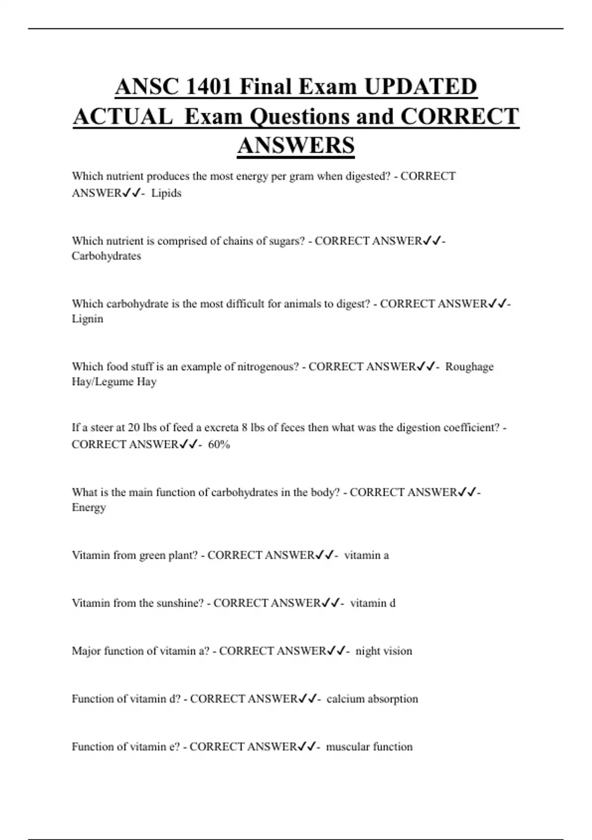 ANSC 1401 Final Exam UPDATED ACTUAL Exam Questions and CORRECT ANSWERS Which nutrient produces the most energy per gram when digested? - CORRECT ANSWER- Lipids Which nutrient is comprised of chains of sugars? - CORRECT ANSWER- Carbohydrates Which carbohydrate is the most difficult for animals to digest? - CORRECT ANSWER- Lignin