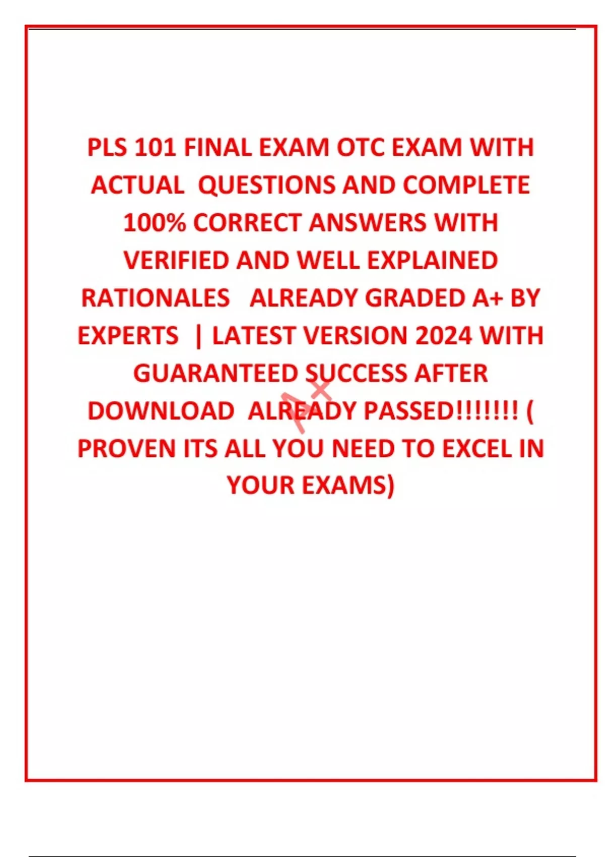 PLS 101 FINAL EXAM OTC EXAM WITH ACTUAL QUESTIONS AND COMPLETE 100% CORRECT ANSWERS WITH VERIFIED AND WELL EXPLAINED RATIONALES ALREADY GRADED A+ BY EXPERTS | LATEST VERSION 2024 WITH GUARANTEED SUCCESS AFTER DOWNLOAD ALREADY PASSED!!!!!!! ( PROVEN
