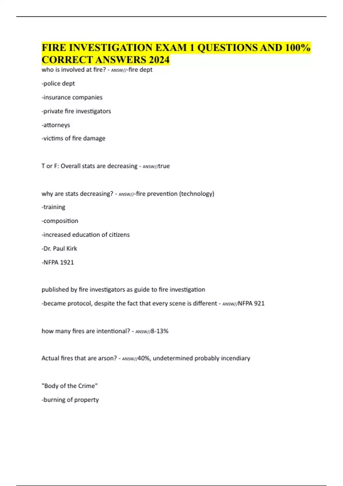 FIRE INVESTIGATION EXAM 1 QUESTIONS AND 100% CORRECT ANSWERS 2024 who is involved at fire? - ANSW//-fire dept -police dept -insurance companies -private fire investigators -attorneys -victims of fire damage T or F: Overall stats are decreasing - ANSW//true why are stats decreasing? - ANSW//-fire prevention (technology) -training -composition -increased education of citizens -Dr. Paul Kirk -NFPA 1921 published by fire investigators as guide to fire investigation -became protocol, despite the fact that every scene is different - ANSW//NFPA 921 how many fires are intentional? - ANSW//8-13% Actual fires that are arson? - ANSW//40%, undetermined probably incendiary "Body of the Crime" -