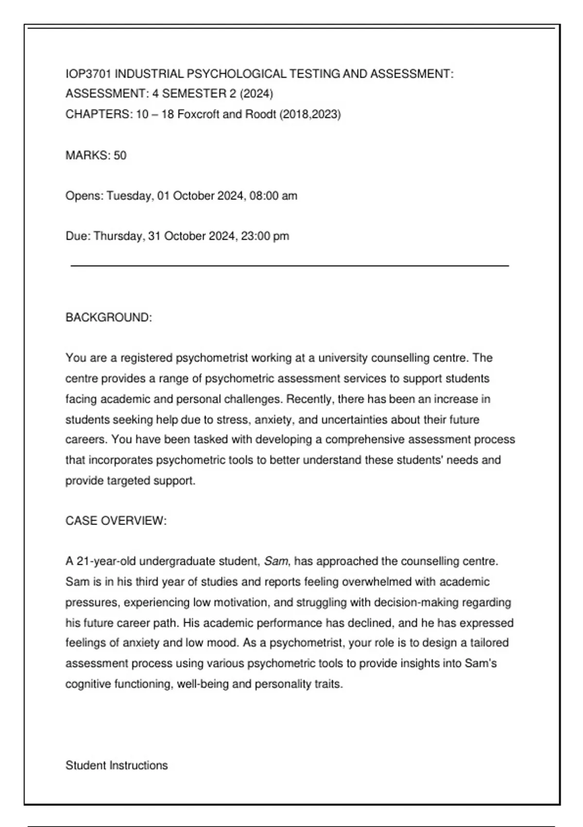 IOP3701 INDUSTRIAL PSYCHOLOGICAL TESTING AND ASSESSMENT: