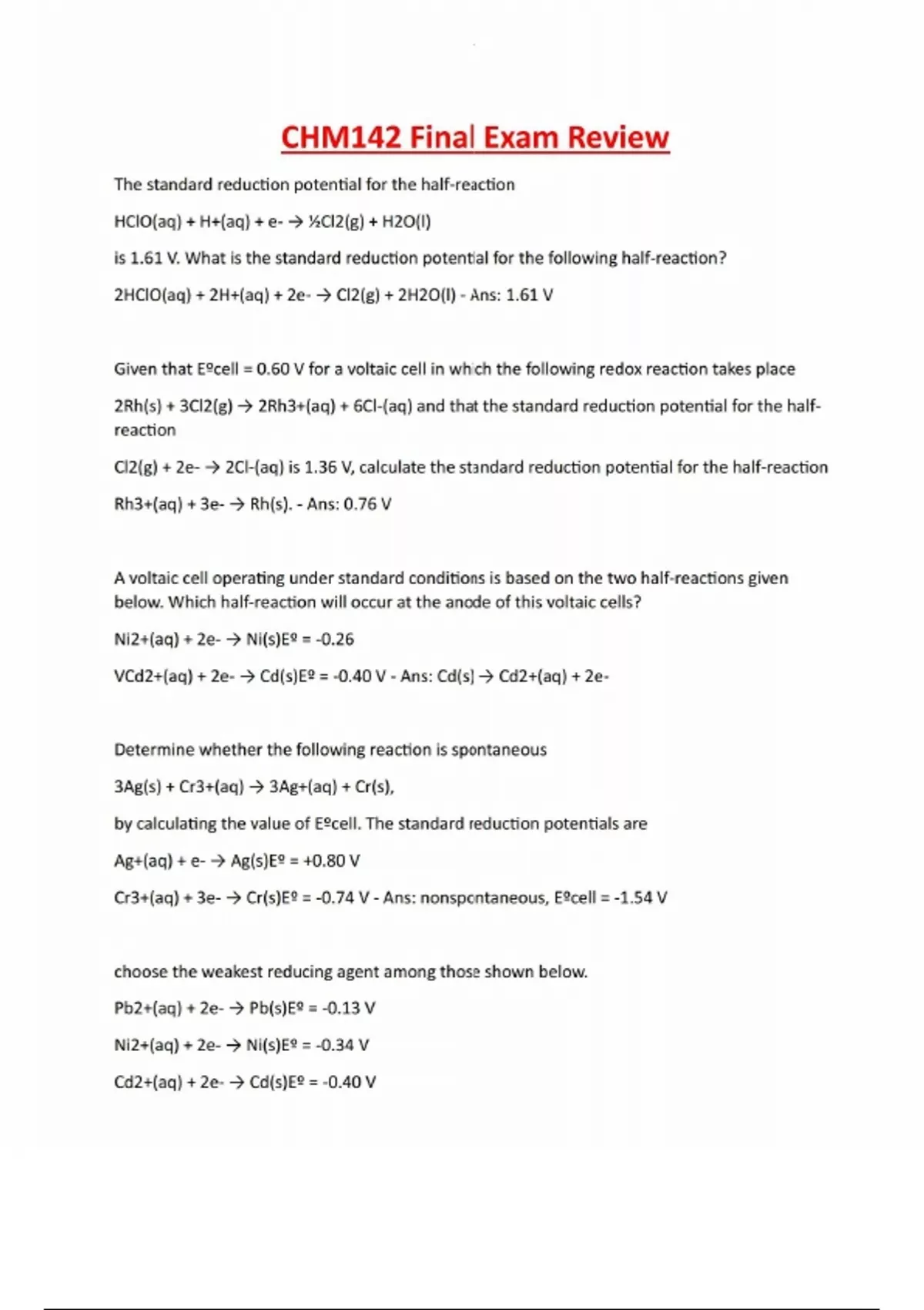 CHM142 Final Exam Review with correct solutions 2024/2025 University of Miami