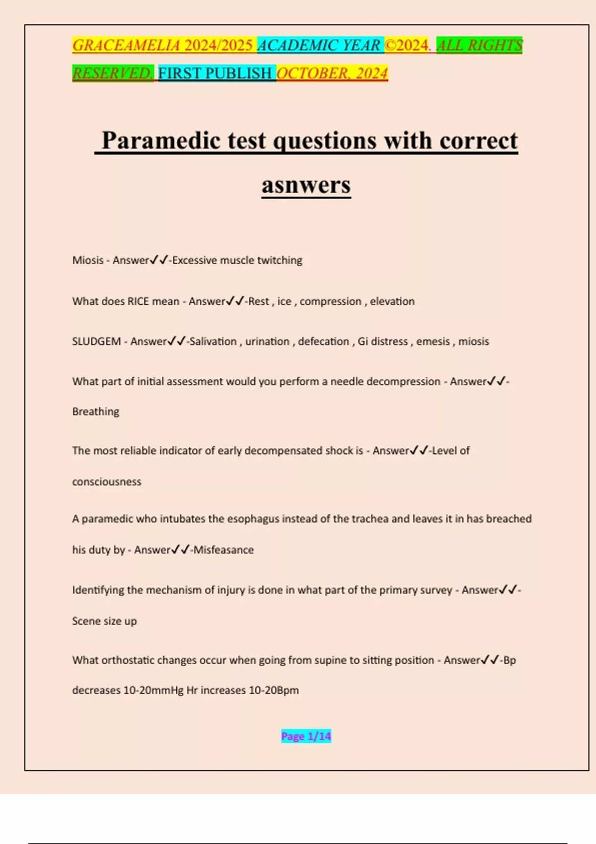 Paramedic test questions with correct