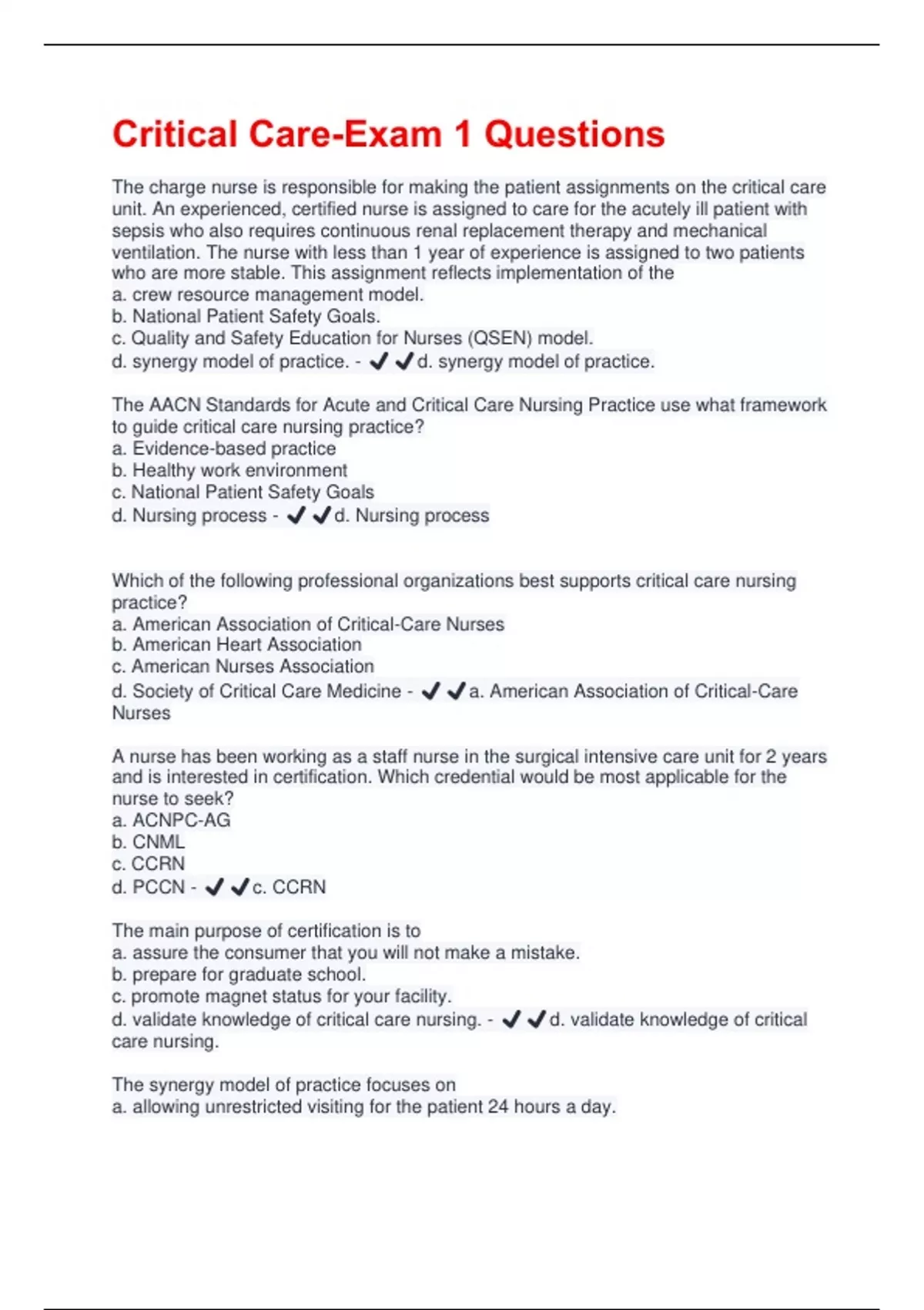 d. validate knowledge of critical care nursing. - ✔️✔️d. validate knowledge of critical