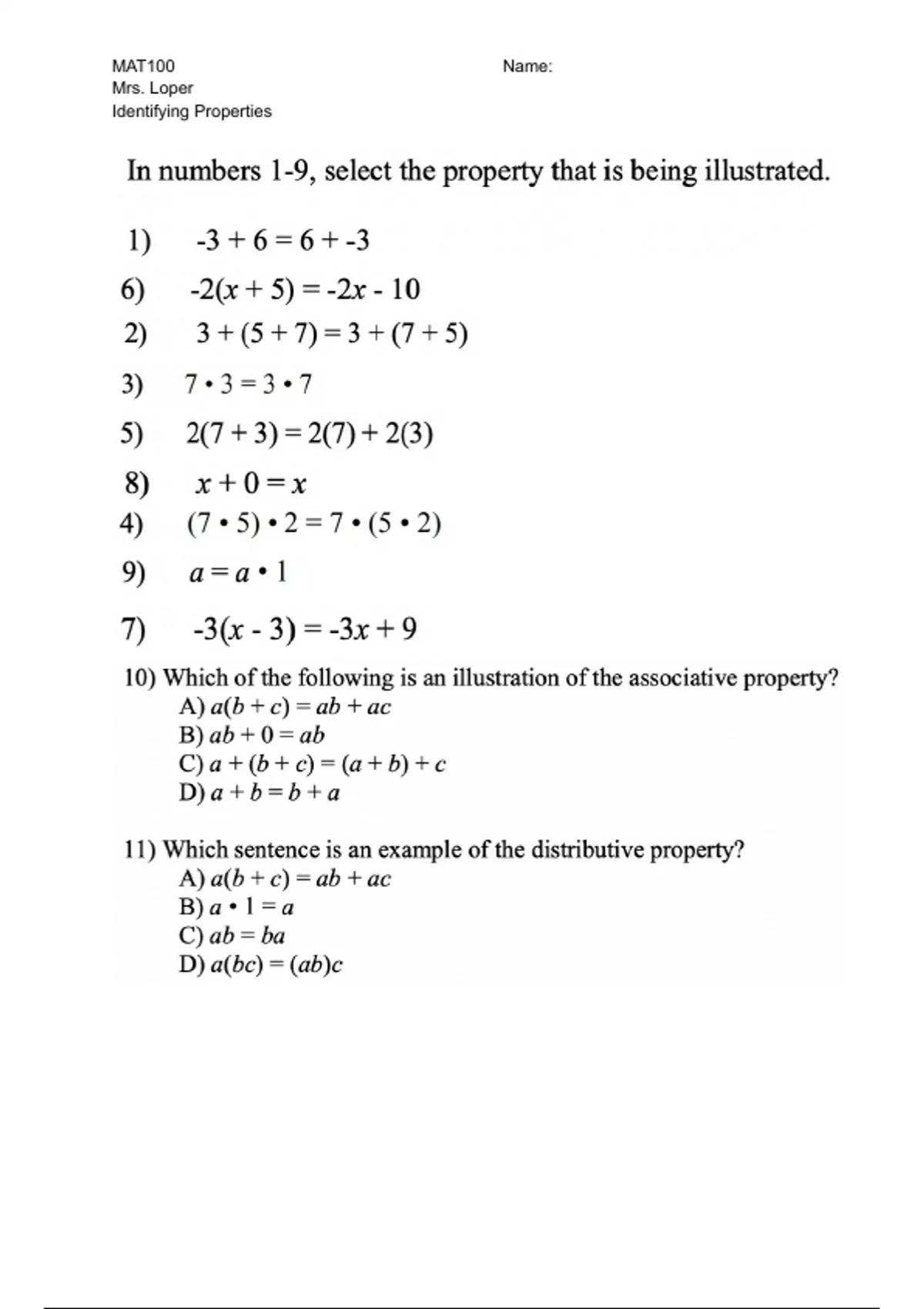 Pre College Algebra Identifying Properties
