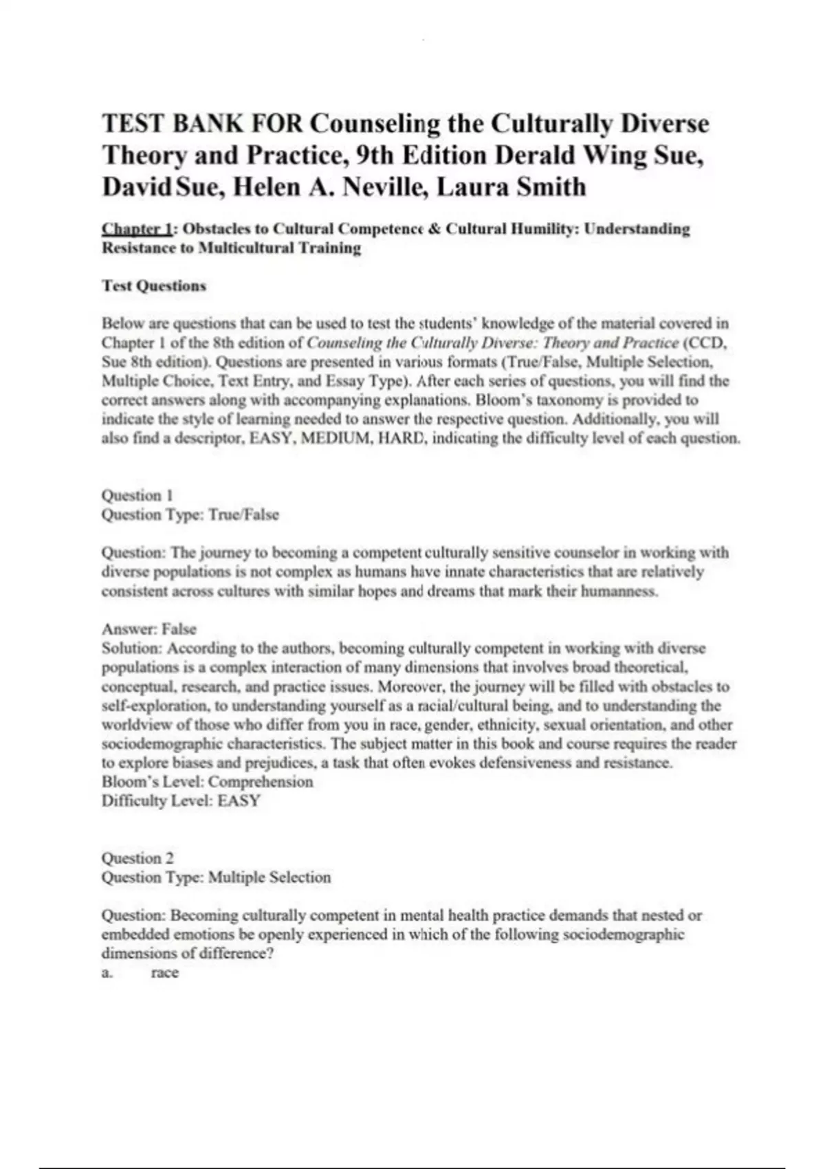 TEST BANK FOR Counseling the Culturally Diverse Theory and Practice, 9th Edition Derald Wing Sue, David Sue, Helen A. Neville, Laura Smith-Question: The journey to becoming a competent culturally sensitive counselor in working with diverse populations is not complex as humans have innate characteristics that are relatively consistent across cultures with similar hopes and dreams that mark their humanness. Answer: False Solution: According to the authors, becoming culturally competent in working with diverse populations is a complex interaction of many dimensions that involves broad theoretical, conceptual, research, and practice issues. Moreover, the journey will be filled with obstacles to self-exploration, to understanding yourself as a racial/cultural being, and to understanding the worldview of those who differ from you in race, gender, ethnicity, sexual orientation, and other sociodemographic characteristics. The subject matter in this book and course requires the reader to explore biases and prejudices, a task that often evokes defensiveness and resistance. Bloom’s Level: Comprehension Difficulty Level: EASY Question 2 Question Type: Multiple Selection Question: Becoming culturally competent in mental health practice demands that nested or embedded emotions be openly experienced in which of the following sociodemographic dimensions of difference? a. race b. culture c. gender d. sexual orientation e. only a and b Answer: a, b, c, d Solution: The authors point out that the journey to becoming culturally competent therapists is filled with obstacles to self-exploration, to understanding oneself as a racial/cultural being, and to understanding the worldview of those who differ from others in terms of race, gender, ethnicity, sexual orientation, and other sociodemographic dimensions. Bloom’s Level: Knowledge Difficulty Level: MEDIUM Question 3 Question Type: Text Entry Question: The three types of resistance that are often encountered by students studying diversity training are: , , . a. cognitive; emotional; behavioral b. psychological; physiological; emotional c. dissonance; isolation; invalidation d. physical; emotional; spiritual Answer: a Solution: The authors report that in work with resistance to diversity training, research reveals how it is likely to be manifested in three forms: cognitive resistance, emotional resistance, and behavioral resistance (Sue, 2015, as cited in Sue 8th edition). Bloom’s Level: Knowledge Difficulty Level: MEDIUM Question 4 Question Type: Essay Type Question: Identify at least three emotions you experienced as you read the reactions of the four students. Reflect on why you feel those emotions surfaced. Solution: Responses will vary but, according to the authors, one of the greatest concerns of instructors is the strong emotive reactions of students to the material: grief, anger, depression, and guilt in working through the content. Bloom’s Level: Synthesis Difficulty Level: HARD Question 5 Question Type: True/False Question. The burden to become multiculturally competent rests on the trainees from dominant culture as in most cases they have been the ones to marginalize, stereotype, and oppress minority cultures. Thus, it is the responsibility of the dominant culture to help rectify this in raising awareness and also in becoming competent in working with diverse populations. Answer: False Solution: Understanding multicultural counseling competence applies equally to trainees from dominant and marginalized groups and to helping professionals. Bloom’s Level: Application Difficulty Level: MEDIUM Question 6 Question Type: Multiple Selection