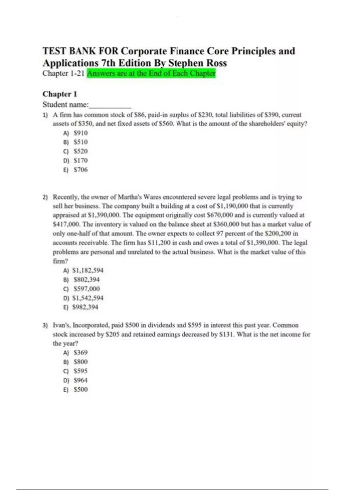TEST BANK FOR Corporate Finance Core Principles and Applications 7th Edition By Stephen Ross-A firm has common stock of $86, paid-in surplus of $230, total liabilities of $390, current assets of $350, and net fixed assets of $560. What is the amount of the shareholders' equity? A) $910 B) $510 C) $520 D) $170 E) $706 2) Recently, the owner of Martha's Wares encountered severe legal problems and is trying to sell her business. The company built a building at a cost of $1,190,000 that is currently appraised at $1,390,000. The equipment originally cost $670,000 and is currently valued at $417,000. The inventory is valued on the balance sheet at $360,000 but has a market value of only one-half of that amount. The owner expects to collect 97 percent of the $200,200 in accounts receivable. The firm has $11,200 in cash and owes a total of $1,390,000. The legal problems are personal and unrelated to the actual business. What is the market value of this firm? A) $1,182,594 B) $802,394 C) $597,000 D) $1,542,594 E) $982,394 3) Ivan's, Incorporated, paid $500 in dividends and $595 in interest this past year. Common stock increased by $205 and retained earnings decreased by $131. What is the net income for the year? A) $369 B) $800 C) $595 D) $964 E) $500 4) The tax rates for a particular year are shown below: Taxable Income Tax Rate $0 – 50,000 15% 50,001 – 75,000 25% 75,001 – 100,000 34% 100,001 – 335,000 39% What is the average tax rate for a firm with taxable income of $124,013? A) 39.00% B) 36.39% C) 20.00% D) 27.98% E) 25.49% 5) The tax rates are as shown below: Taxable Income Tax Rate $0 – 50,000 15% 50,001 – 75,000 25% 75,001 – 100,000 34% 100,001 – 335,000 39% Your firm currently has taxable income of $81,700. How much additional tax will you owe if you increase your taxable income by $22,900? A) $7,626 B) $8,016 C) $8,931 D) $7,636 E) $7,786 6) Your firm has net income of $371 on total sales of $1,460. Costs are $800 and depreciation is $130. The tax rate is 30 percent. The firm does not have interest expenses. What is the operating cash flow? A) $501 B) $660 C) $901 D) $530 E) $371 7) Teddy's Pillows had beginning net fixed assets of $477 and ending net fixed assets of $562. Assets valued at $325 were sold during the year. Depreciation was $54. What is the amount of net capital spending? A) $464 B) $139 C) $85 D) $31 E) $291 8) At the beginning of the