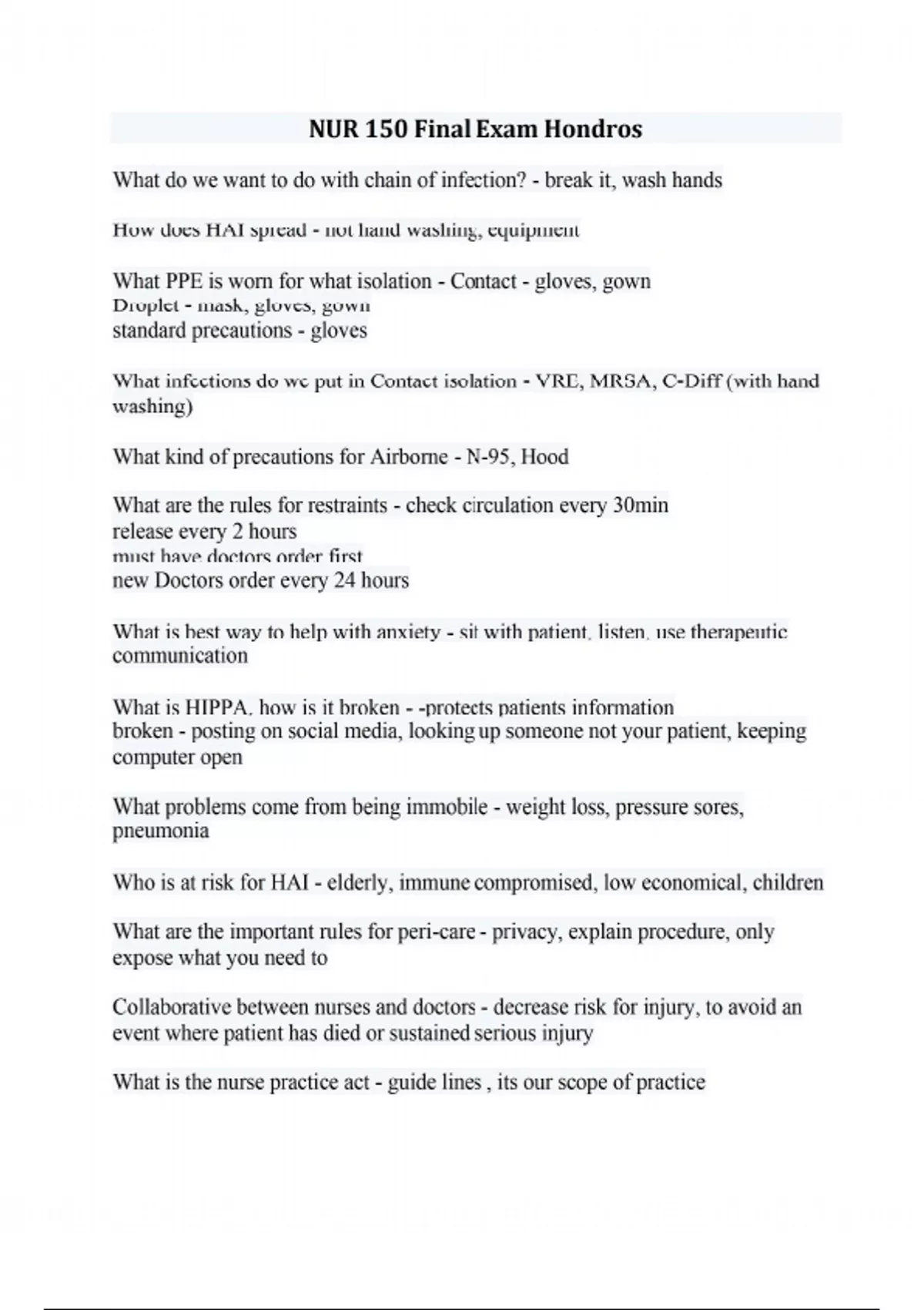 What do we want to do with chain of infection? - break it, wash hands How does HAI spread - not hand washing, equipment What PPE is worn for what isolation - Contact - gloves, gown Droplet - mask, gloves, gown standard precautions - gloves What infections do we put in Contact isolation - VRE, MRSA, C-Diff (with hand washing) What kind of precautions for Airborne - N-95, Hood What are the rules for restraints - check circulation every 30min release every 2 hours must have doctors order first new Doctors order every 24 hours What is best way to help with anxiety - sit with patient, listen, use therapeutic communication What is HIPPA, how is it broken - -protects patients information broken - posting on social media, looking up someone not your patient, keeping computer open What problems come from being immobile - weight loss, pressure sores, pneumonia Who is at risk for HAI - elderly, immune compromised, low economical, children What are the important rules for peri-care - privacy, explain procedure, only expose what you need to Collaborative between nurses and doctors - decrease risk for injury, to avoid an event where patient has died or sustained serious injury What is the nurse practice act - guide lines , its our scope of practice How do we check a tympanic temp - up, back for an adult What is ethics - compassion, empathy What pulse do we check most often - radial What is first thing we do after a fall - vital signs, assessment What do we do if we find a patient unresponsive - check cardioid pulse Ways to prevent CAUTI"S - out ASAP, empty bag regularly, keep bag lower than bladder, change every 30 days, peri-care Prone position - laying face down Sims position - laying on right side, knee-thigh drawn up to chest Dorsal recumbent - laying on back with knees bent with feet still flat on ground Lithotomy - laying supine with hips knees flexed and thigh externally rotated Supine position - laying flat on back face up Trendelenburg position - head of bed pointed downward, feet in air Orthopnic - sitting on side of bed with arms rested on over bed table. this is used for people with breathing problems Where is apical pulse - mid-clavicular 5th intercostal space What are examples of portals of entry for infection - mouth, break in skin, mucous membrane How do we prevent falls - falls assessment on admission, keep room clutter free, toilet schedule, keep things in arms reach What is therapeutic communication - ones that leave it open for patient to communicate to or discuss something, ask them to give you an example of something about what they mean What kind of meds can't be given by G-tube - enteric coded, capsules, extended release What are the 6 rights of Medications - medication, patient, dose, route, time, documentation What is term when one drug mixes with another drug - drug interaction What is drug compatibility - when different drugs can be given together What is drug tolerance - when your body builds up What are drug adverse effects - undesirable effects ex: HA, nauesa What tools are for measure functional status - Lawton (IADL) Katz (ADL) What tools do we measure cognition - Montreal, Mini-cog How do we reduce pressure sores - reposition, high-fiber diet, change incont as often as possible What are signs and symptoms of dehydration - slurred speech, skin tint, low urine output, dry mucus membranes, BP low while Pulse High What do we do when a patient refuse a med - educate, document What are parts to drug order - drug name, dose, frequency, route, amount What is healthy people 2020 - website that promotes healthy living and decreasing disease What are signs/symptoms of dysphagia - choking, drooling, pocketing food What are the dysphagia precautions - no straws, fowlers position after food/drink , have them put chin to chest when swallowing What happens if the precautions are not put in place - aspiration pneumonia How can we assess LOC - ask name, place, date, situation