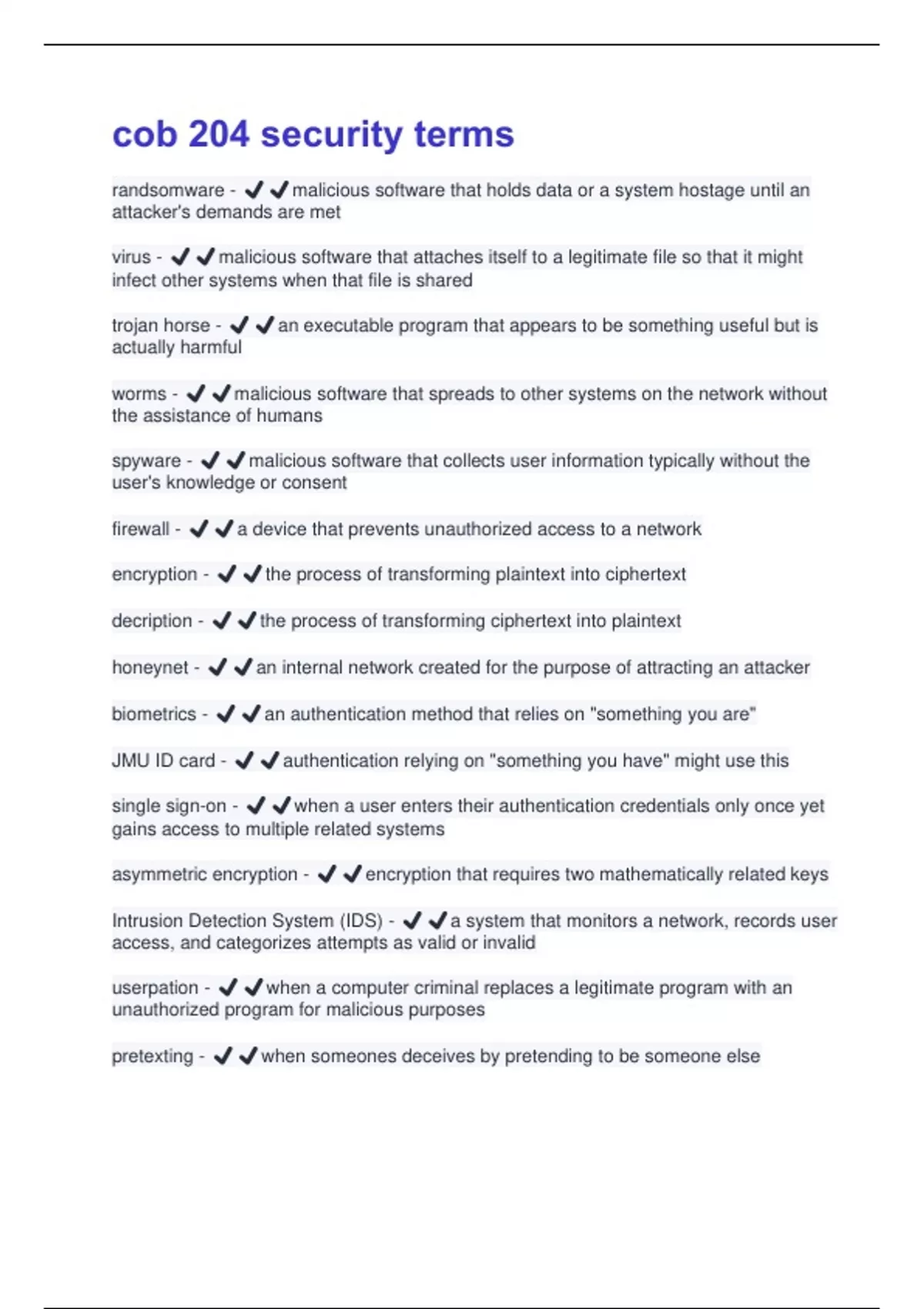 worms - ✔️✔️malicious software that spreads to other systems on the network without
