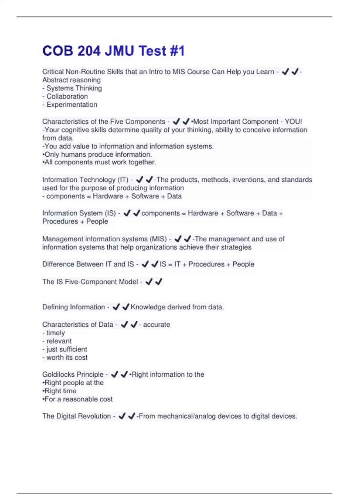 Critical Non-Routine Skills that an Intro to MIS Course Can Help you Learn - ️️- Abstract reasoning - Systems Thinking - Collaboration - Experimentation Characteristics of the Five Components - ️️•Most Important Component - YOU! -Your cognitive skills determine quality of your thinking, ability to conceive information from data. -You add value to information and information systems. •Only humans produce information. •All components must work together. Information Technology (IT) - ️️-The products, methods, inventions, and standards used for the purpose of producing information - components = Hardware + Software + Data Information System (IS) - ️️components = Hardware + Software + Data + Procedures + People Management information systems (MIS) - ️️-The management and use of information systems that help organizations achieve their strategies Difference Between IT and IS - ️️IS = IT + Procedures + People The IS Five-Component Model - ️️ Defining Information - ️️Knowledge derived from data. Characteristics of Data - ️️- accurate - timely - relevant - just sufficient - worth its cost Goldilocks Principle - ️️•Right information to the •Right people at the •Right time •For a reasonable cost The Digital Revolution - ️️-From mechanical/analog devices to digital devices.Information Age - ️️-Production, distribution, control of information primary economic drivers. Five Technology "Laws" - ️️-Bell's, Moore's, Metcalfe's, Neilsen's, & Kryder's Bell's Law - ️️- Today's highly successful business could be bankrupt quickly because technology changed and it didn't. Business professionals need to... - ️️-Take active role to ensure systems meet their needs. -Understand how information systems (IS) are constructed. -Consider users' needs during development. -Learn how to use IS. -Don't forget security and backups. - "A new computer class forms roughly each decade establishing a new industry." Implications: Digital devices will evolve so quickly that they will enable new platforms, programming environments, industries, networks, and information systems every 10 years Moore's Law - ️️"The number of transistors per square inch on an integrated chip doubles every 18 months." Implications: Computers are getting exponentially faster. The cost of data processing is approaching zero.