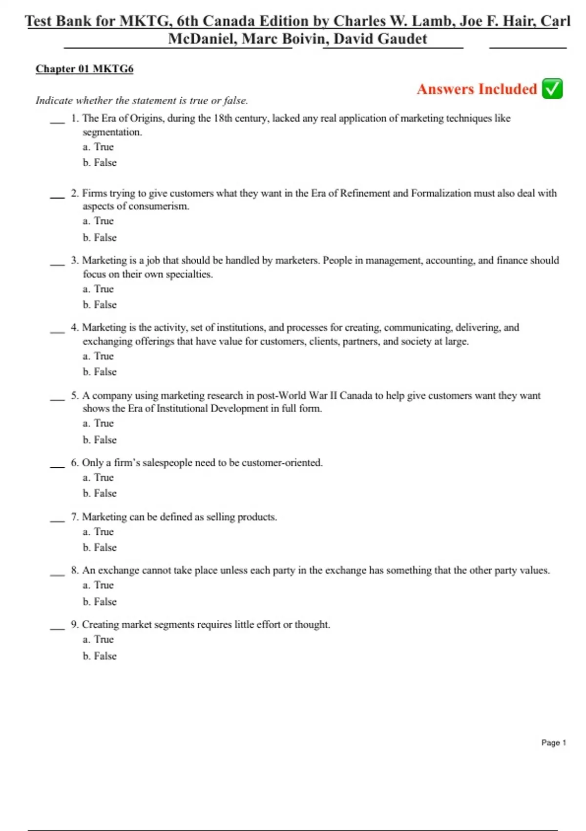 Complete Test Bank for MKTG, 6th Canadian Edition by Charles W. Lamb, Joe F. Hair, Carl McDaniel, Marc Boivin, David Gaudet, Janice Shearer ; ISBN13: 9781778410390.....(Full Chapters included Chapter 1 to 16)...1 An Introduction to Marketing 2 The External Marketing Environment 3 Strategic Marketing 4 Marketing Research and Analytics 5 Consumer Decision Making 6 Business-to-Business Marketing 7 Segmenting, Targeting, and Positioning 8 Brand Management 9 Product Concepts 10 Services and Non-profit Organization Marketing 11 Price Setting 12 Marketing Channels 13 Marketing Communications 14 Digital Storytelling 15 (Online Chapter) Global Marketing 16 Customer Relationship Management (CRM)