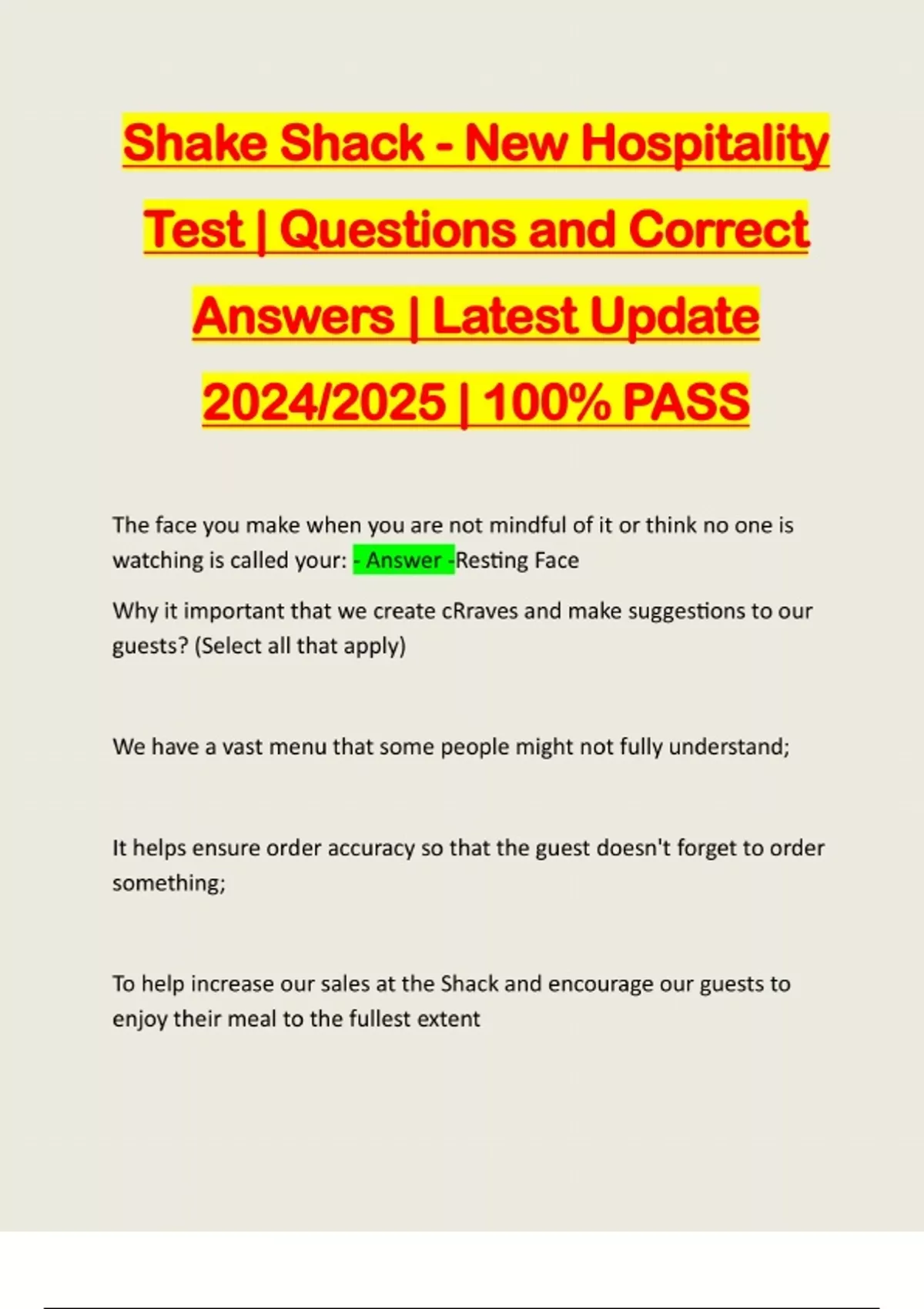Shake Shack - New Hospitality Test | Questions and Correct Answers | Latest Update 2024/2025 | 100% PASS The face you make when you are not mindful of it or think no one is watching is called your: - Answer -Resting Face Why it important that we create cRraves and make suggestions to our guests? (Select all that apply) We have a vast menu that some people might not fully understand; It helps ensure order accuracy so that the guest doesn't forget to order something; To help increase our sales at the Shack and encourage our guests to enjoy their meal to the fullest extentTo make sure our guests order a menu item from each station, keeping our Team Members active - Answer -1st, 2nd, and 3rd answer choices (We have a vast menu that some people might not fully understand; It helps ensure order accuracy so that the guest doesn't forget to order something; To help increase our sales at the Shack and encourage our guests to enjoy their meal to the fullest extent) Key words: people do NOT need to order an