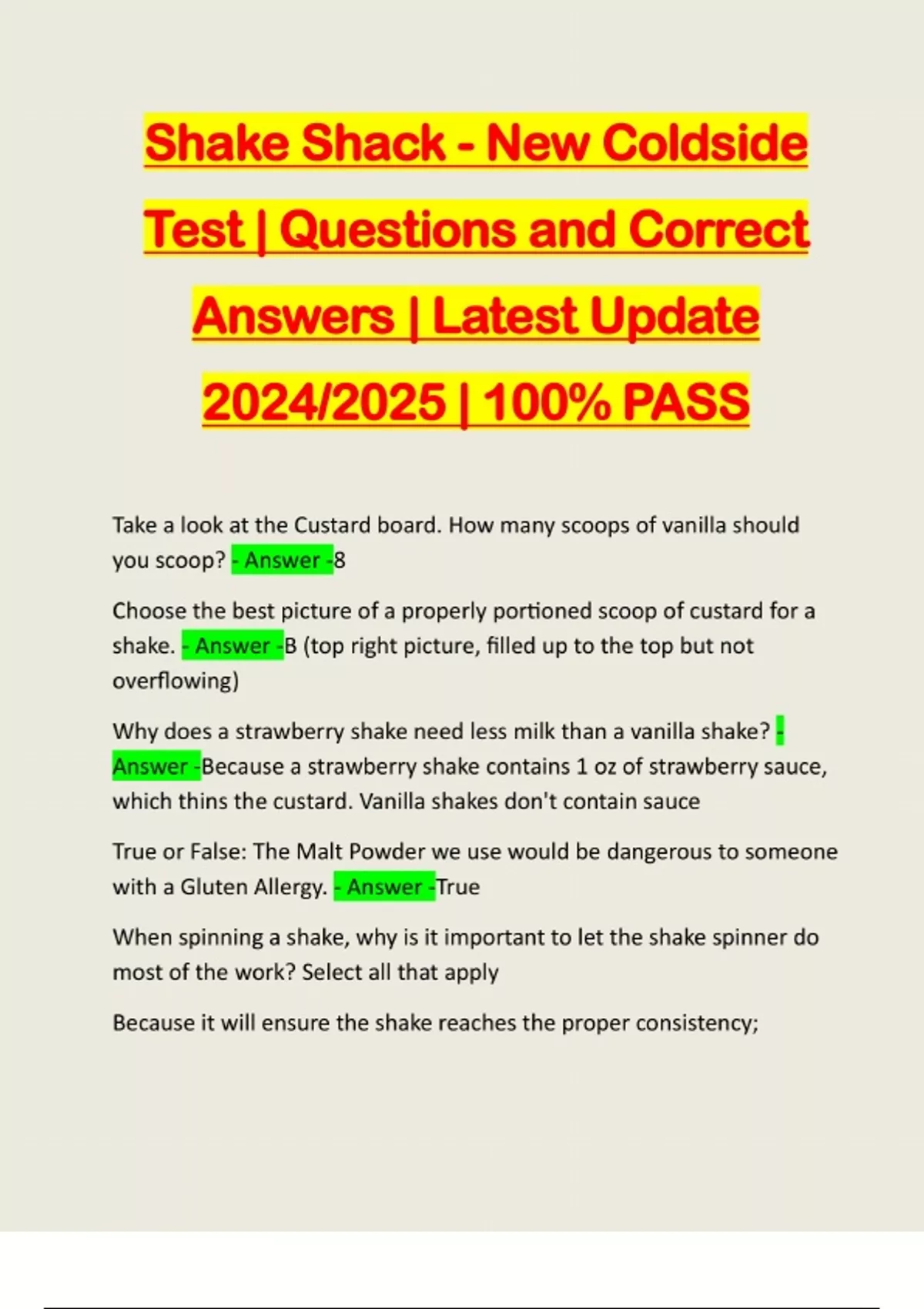 Shake Shack - New Coldside Test | Questions and Correct Answers | Latest Update 2024/2025 | 100% PASS Take a look at the Custard board. How many scoops of vanilla should you scoop? - Answer -8 Choose the best picture of a properly portioned scoop of custard for a shake. - Answer -B (top right picture, filled up to the top but not overflowing) Why does a strawberry shake need less milk than a vanilla shake? - Answer -Because a strawberry shake contains 1 oz of strawberry sauce, which thins the custard. Vanilla shakes don't contain sauce True or False: The Malt Powder we use would be dangerous to someone with a Gluten Allergy. - Answer -True When spinning a shake, why is it important to let the shake spinner do most of the work? Select all that apply Because it will ensure the shake rea