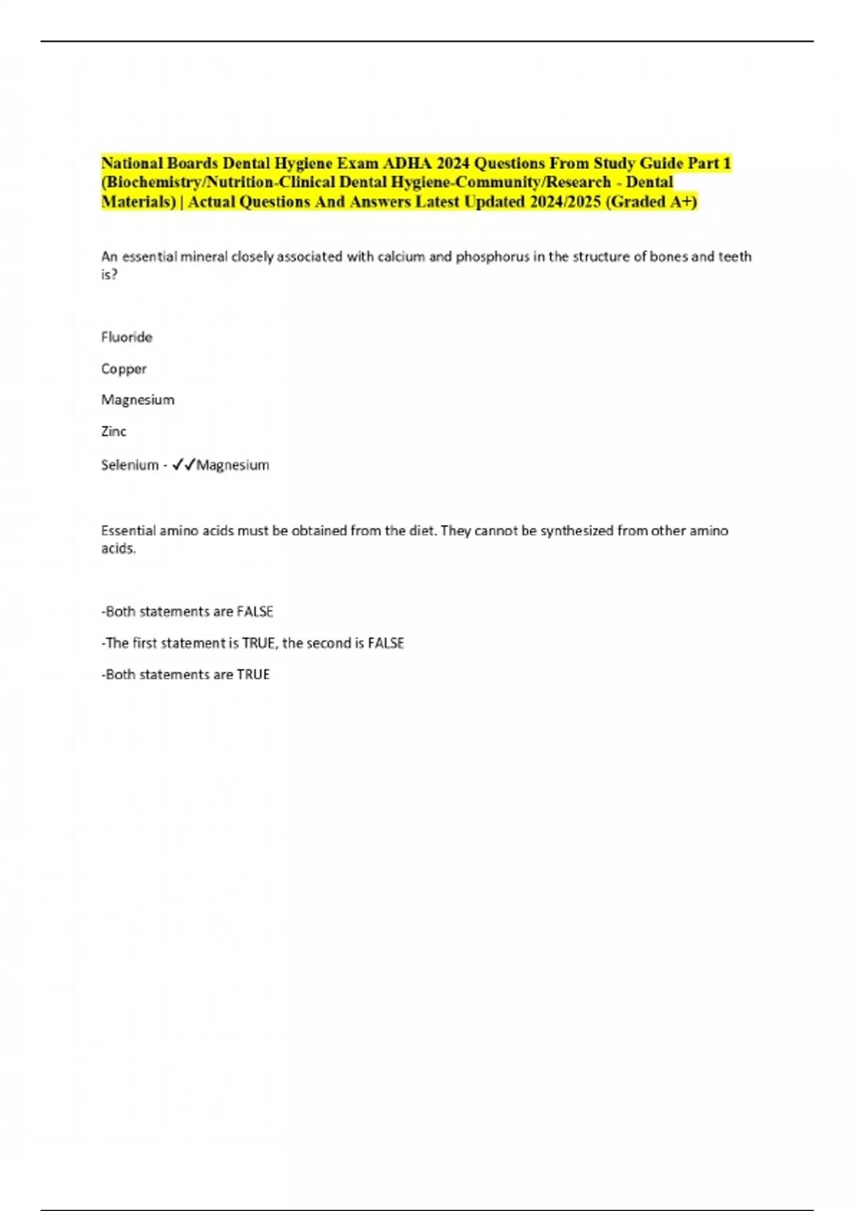 National Boards Dental Hygiene Exam ADHA 2024 Questions From Study Guide Part 1 (Biochemistry/Nutrition-Clinical Dental Hygiene-Community/Research - Dental Materials) | Actual Questions And Answers Latest Updated 2024/2025 (Graded A+)