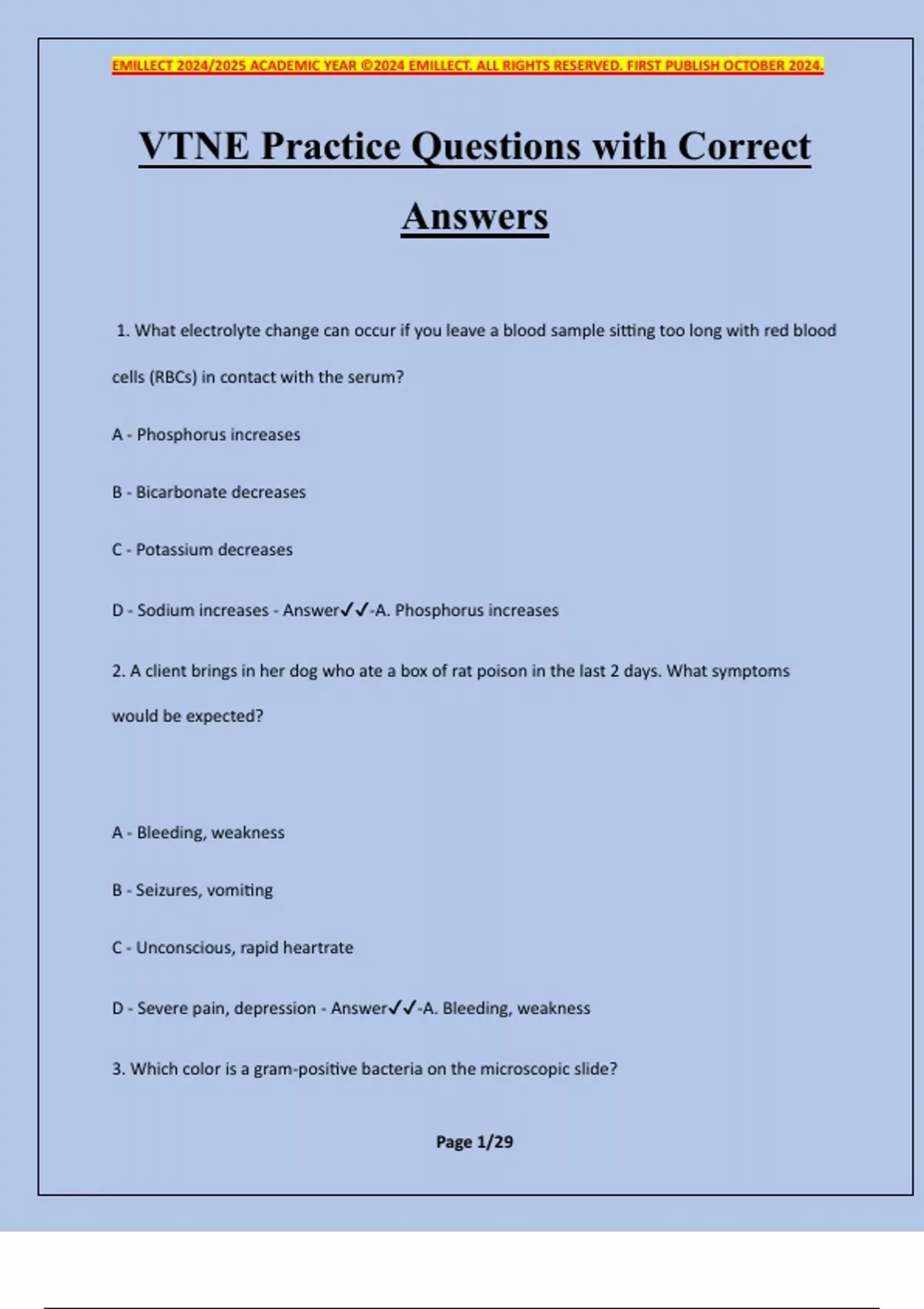 VTNE Practice Questions with Correct Answers 1. What electrolyte change can occur if you leave a blood sample sitting too long with red blood cells (RBCs) in contact with the serum? A - Phosphorus increases B - Bicarbonate decreases C - Potassium decreases D - Sodium increases - Answer-A. Phosphorus increases 2. A client brings in her dog who ate a box of rat poison in the last 2 days. What symptoms would be expected? A - Bleeding, weakness B - Seizures, vomiting C - Unconscious, rapid heartrate D - Severe pain, depression - Answer-A. Bleeding, weakness 3. Which color is a gram-positive bacteria on the microscopic slide? EMILLECT 2024/2025 ACADEMIC YEAR ©2024 EMILLECT. ALL RIGHTS RESERVED. FIRST PUBLISH OCTOBER 2024. Page 2/29 A - Red B - Blue C - Orange D - Green - Answer-B. Blue 4. What lab result would you expect to find in a cat with Diabetes mellitus? A - Increased urine glucose; Decreased blood glucose B - Low urine glucose; Normal blood glucose C - Increased urine glucose, Increased blood glucose D - Urinary infection; Low blood glucose - Answer-C. Increased urine glucose, increased blood glucose 5. Which forceps secure drapes to the patient by penetrating the skin? A - Backhaus B - Roeder C - Brown-Adson D - Crile - Answer-A. Backhaus EMILLECT 2024/2025 ACADEMIC YEAR ©2024 EMILLECT. ALL RIGHTS RESERVED. FIRST PUBLISH OCTOBER 2024. Page 3/29 6. A rare Albanian hairy iguana has been prescribed "Iggy-cote" medicated shampoo q.o.d. for dandruff. How often does the iguana get treated? A - Once a day B - Four times a day C - Every other day D - As needed - Answer-C. Every other day 7. Which two white blood cells are phagocytic (eat foreign cells and material by engulfing them). A - B-Lymphocyte, Eosinophil B - Monocyte, Neutrophil C - Basophil, Lymphocyte D - Neutrophil, Thrombocyte - Answer-B. Monocyte, neutrophil What is a band neutrophil? A - An old neutrophil B - Immature neutrophil C - A depleted neutrophil EMILLECT 2024/2025 ACADEMIC YEAR ©2024 EMILLECT. ALL RIGHTS RESERVED. FIRST PUBLISH OCTOBER 2024. Page 4/29 D - A toxic neutrophil E - A neutrophil that plays the drums - Answer-B. Immature neutrophil 9. How do you prevent laryngospasm in cats before inducing anesthesia? A - Pre-medicate with acepromazine B - 1-2% Lidocaine spray C - Pre-medicate with atropine or glycopyrrolate D - Avoid halothane - Answer-B - 1-2% Lidocaine spray