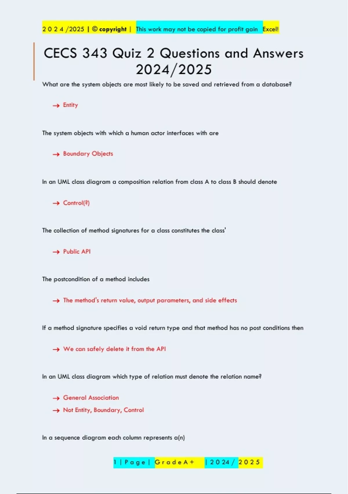 What are the system objects are most likely to be saved and retrieved from a database? → Entity The system objects with which a human actor interfaces with are → Boundary Objects In an UML class diagram a composition relation from class A to class B should denote → Control(?) The collection of method signatures for a class constitutes the class' → Public API The postcondition of a method includes → The method's return value, output parameters, and side effects If a method signature specifies a void return type and that method has no post conditions then → We can safely delete it from the API In an UML class diagram which type of relation must denote the relation name? → General Association → Not Entity, Boundary, Control In a sequence diagram each column represents a(n) 2 0 2 4 /2025 | © copyright | This work may not be copied for profit gain Excel! 1 | P a g e | G r a d e A + | 2 0 24 / 2 0 2 5 → Class or Actor Every Male is a Human. Given class Male and class Human we should create the relation → Male inherits from human In an UML class diagram a composition relation from class A to class B should denote → Only B's cardinality In a sequence diagram the actor may only interact with which kinds of objects? → Boundary only Assume class A contains 1 or more instances of class B and if we delete an instance of class A we must also delete the class B instances it contains. In a UML diagram which diamond do we use and which class should it be connected to directly? → Filled in A In an Object-Oriented Analysis and Design system development, there is usually a one-to-one relationship between → Use Cases and Sequence Diagrams Every Human has 2 parents, each of which is a Human. We should model this relation as (assume a Human's parents can continue to exist when the Human itself no longer exists) → Humans contains 2 Humans via aggregation (empty diamond) 17. The collection of me
