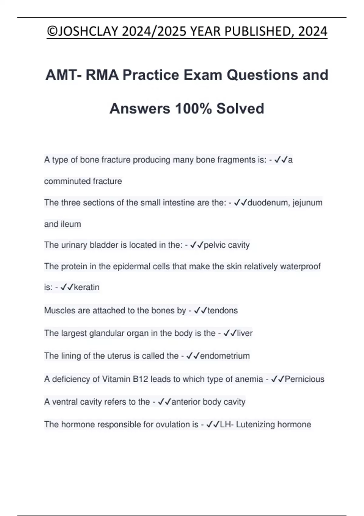 AMT- RMA Practice Exam Questions and Answers 100% Solved A type of bone fracture producing many bone fragments is: - a comminuted fracture The three sections of the small intestine are the: - duodenum, jejunum and ileum The urinary bladder is located in the: - pelvic cavity The protein in the epidermal cells that make the skin relatively waterproof is: - keratin Muscles are attached to the bones by - tendons The largest glandular organ in the body is the - liver The lining of the uterus is called the - endometrium A deficiency of Vitamin B12 leads to which type of anemia - Pernicious A ventral cavity refers to the - anterior body cavity The hormone responsible for ovulation is - LH- Lutenizing hormone